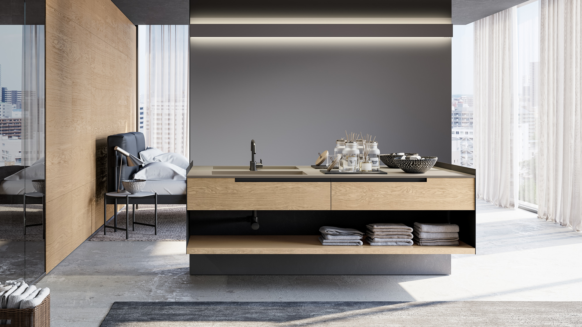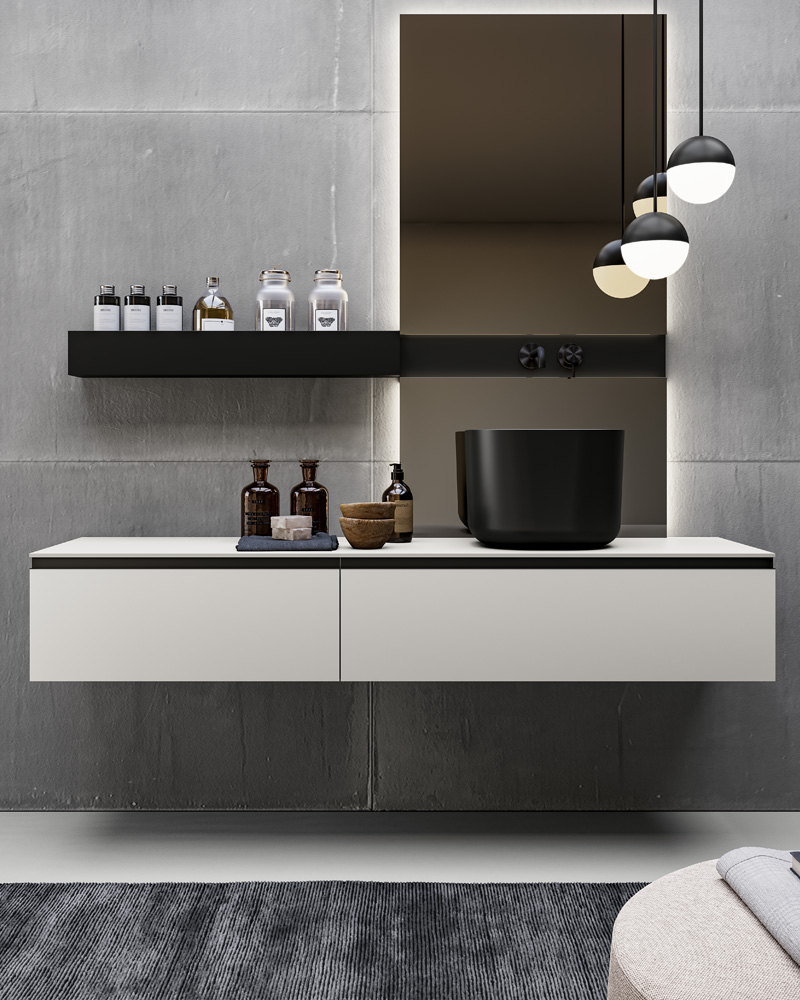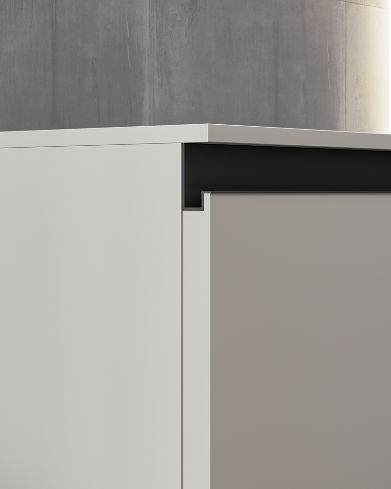 A bathroom furniture range with an essential shapes and clean lines groove opening, in which the research of continuity is realised in the total or partial groove. This creates a distinctive element, which transforms the functionality of the aperture into a decoration for the entire collection.