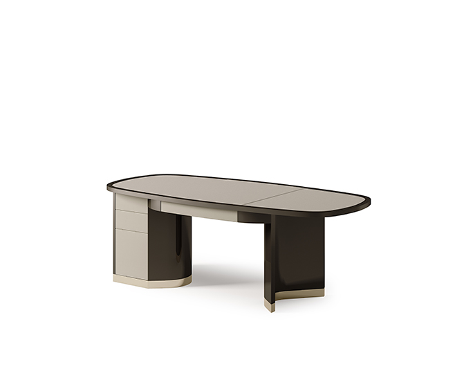 Le superfici possono essere così personalizzate con venature a vista dall’effetto fiammato, per una resa pittorica in contrasto con le forme simmetriche della collezione.
