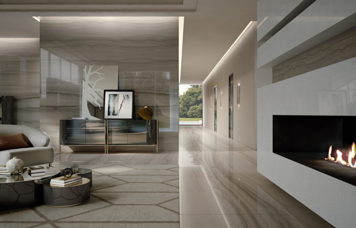 Le superfici possono essere così personalizzate con venature a vista dall’effetto fiammato, per una resa pittorica in contrasto con le forme simmetriche della collezione.