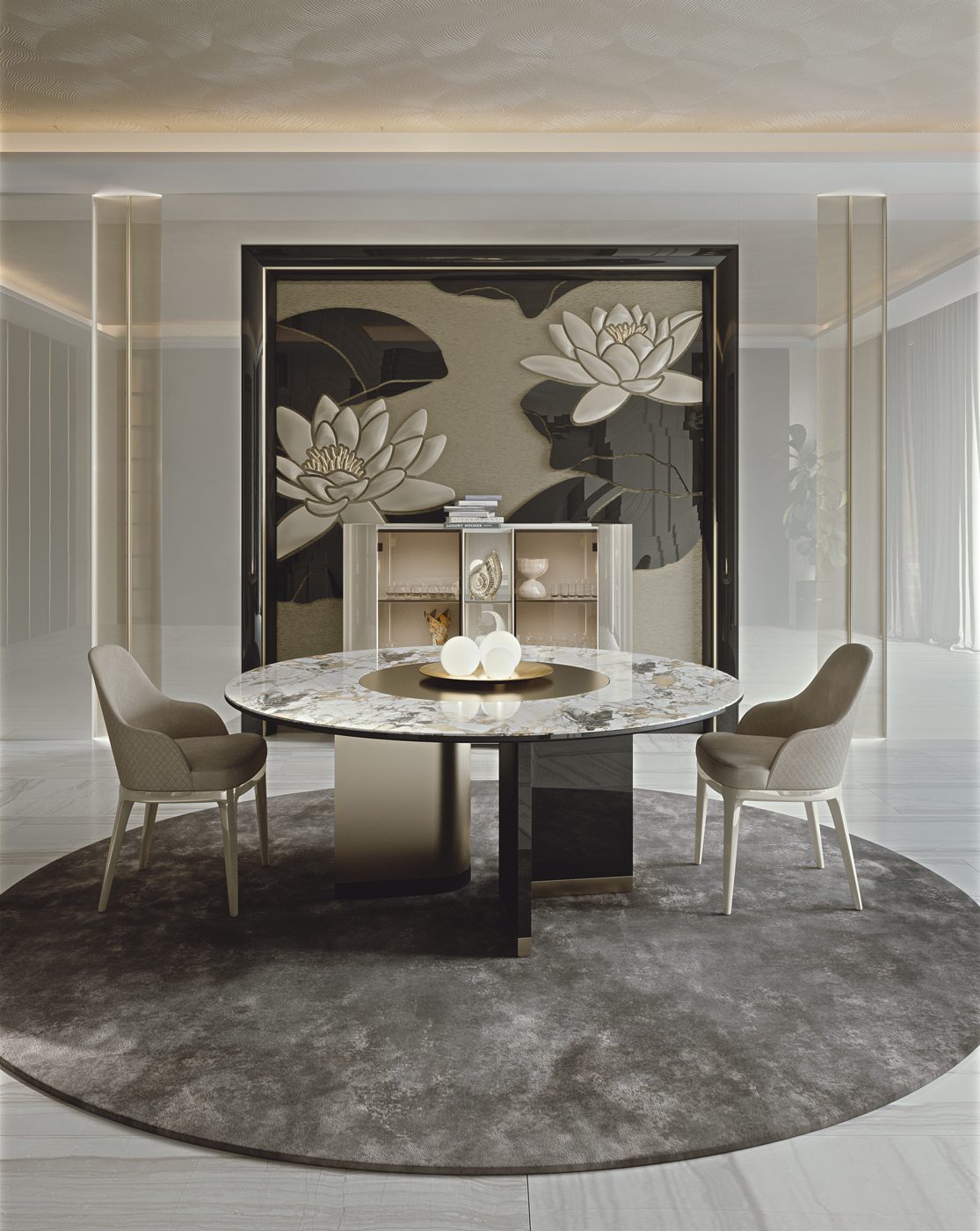 Le superfici possono essere così personalizzate con venature a vista dall’effetto fiammato, per una resa pittorica in contrasto con le forme simmetriche della collezione.