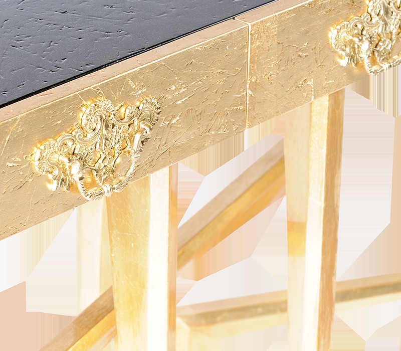 Metropolis console raises the level and expands the limits of design with a base of elegant composition and gracious lines. This exquisite table was designed to add a note of distinctive charm to a living room or a wide hall. Its base is handcrafted from mahogany and the top is framed in particleboard, which gives the black high gloss lacquer its texture appearance. There are four drawers with delicate brass handles. Metropolis is a modern console table available in either black or gold.