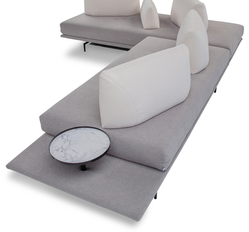 Figlio del Gianduiotto, capostipite della collezione, Gianduiotto Jr è un divano destrutturato, concepito per dare vita a momenti informali e di totale relax. La base, che caratterizza l’intera collezione, rappresenta il vassoio su cui poggia la seduta. I cuscini-spalliera richiamano la forma del cioccolatino e, così come la seduta, sono impreziositi da cuciture dall’effetto impunturato. A completare la comfort experience del modello, un’imbottitura accogliente e morbida.