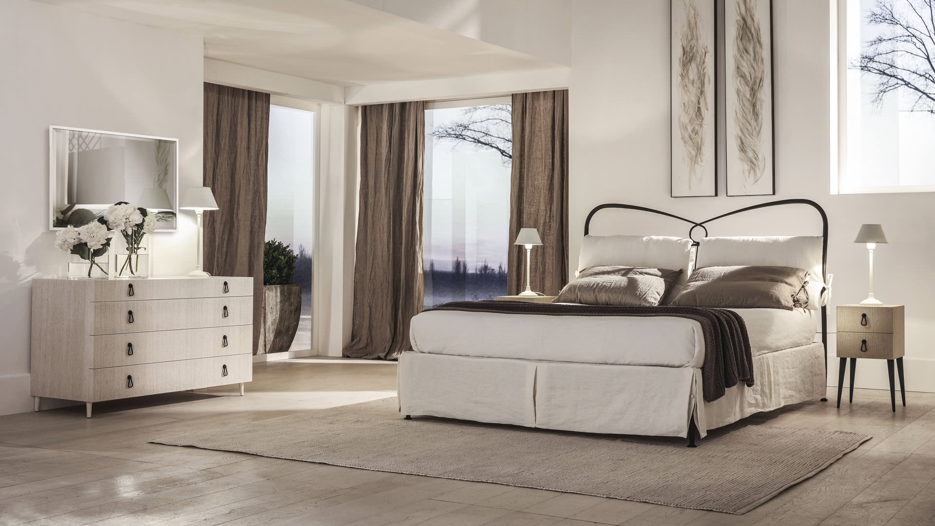 Il top in legno impiallacciato a poro aperto presenta dei cassetti su cui sono applicate delle maniglie gioiello, in oro o bronzo, che ne esaltano la natura vintage. I piedi sono realizzati in metallo conificato a freddo e finiti a bagno di galvanica, in ottone o oro. Il comò City è perfetto per la camera da letto dove insieme al settimino e ai comodini, crea un gruppo notte elegante e moderno.