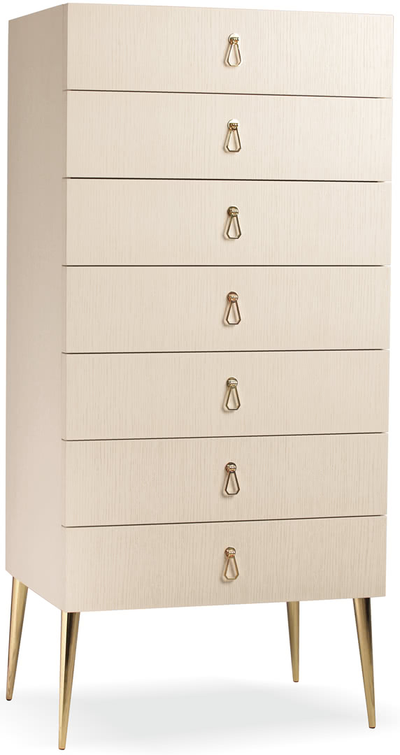 La struttura del settimino, in legno spazzolato a poro aperto, presenta 7 cassetti su cui sono applicate delle maniglie gioiello, in oro o bronzo, che ne esaltano la natura vintage. I piedi sono realizzati in metallo conificato a freddo e finiti a bagno di galvanica, in ottone o oro. La cassettiera City è perfetto per la camera da letto dove insieme al comò e ai comodini, crea un gruppo notte elegante e moderno.