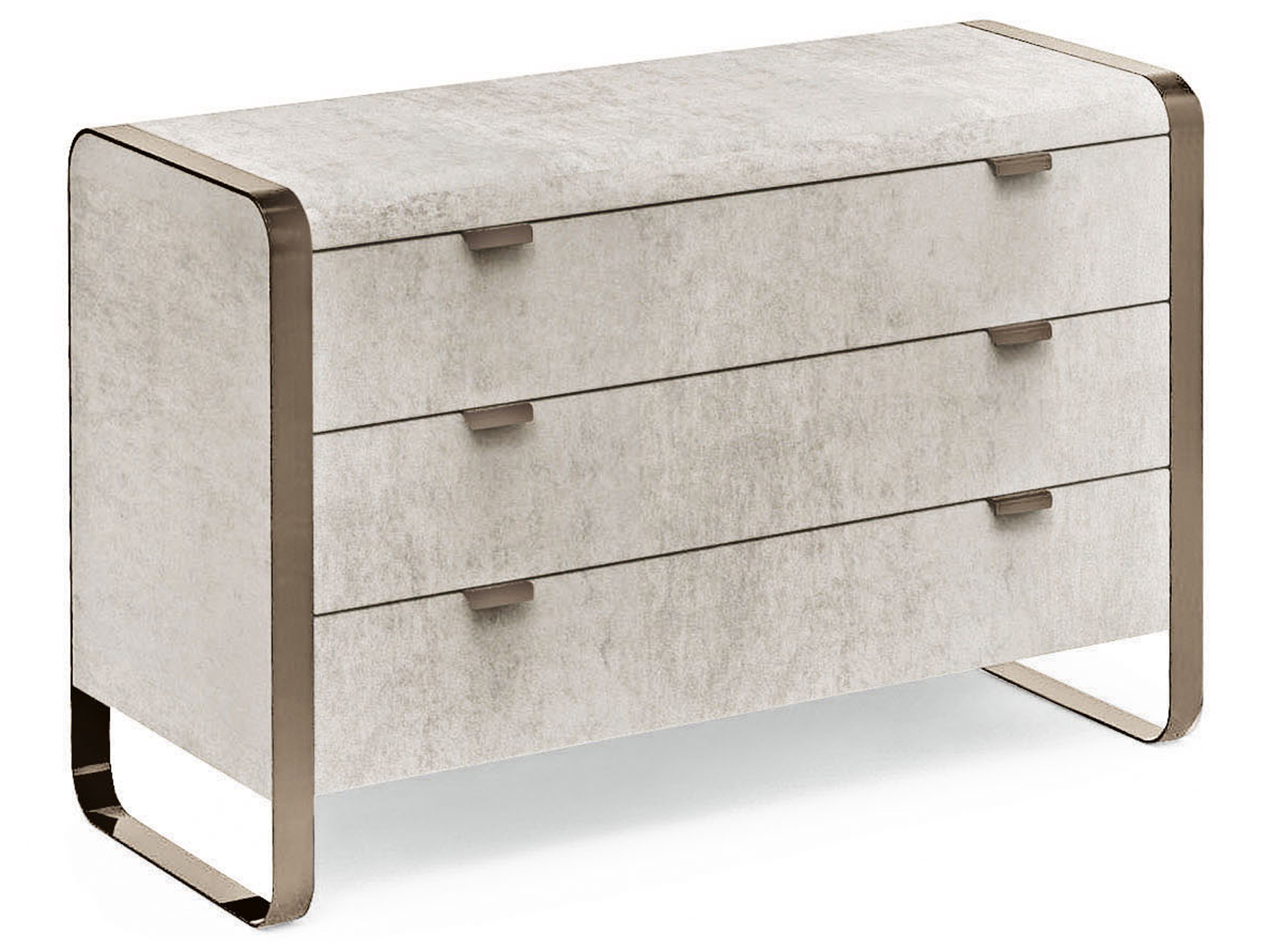 I cassetti, a richiamo frenato, e il top arrotondato sono realizzati in legno e completamente rivestiti in pelle o ecopelle. La struttura in metallo può essere finita in bronzo o in ferro patinato per renderlo “vintage”. Il comò Elvis è perfetto per la camera da letto dove insieme ai comodini, crea un gruppo notte moderno.