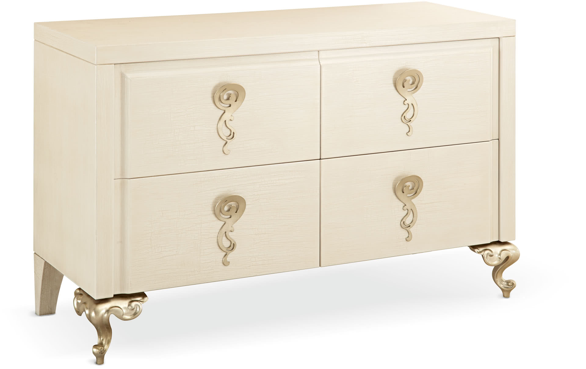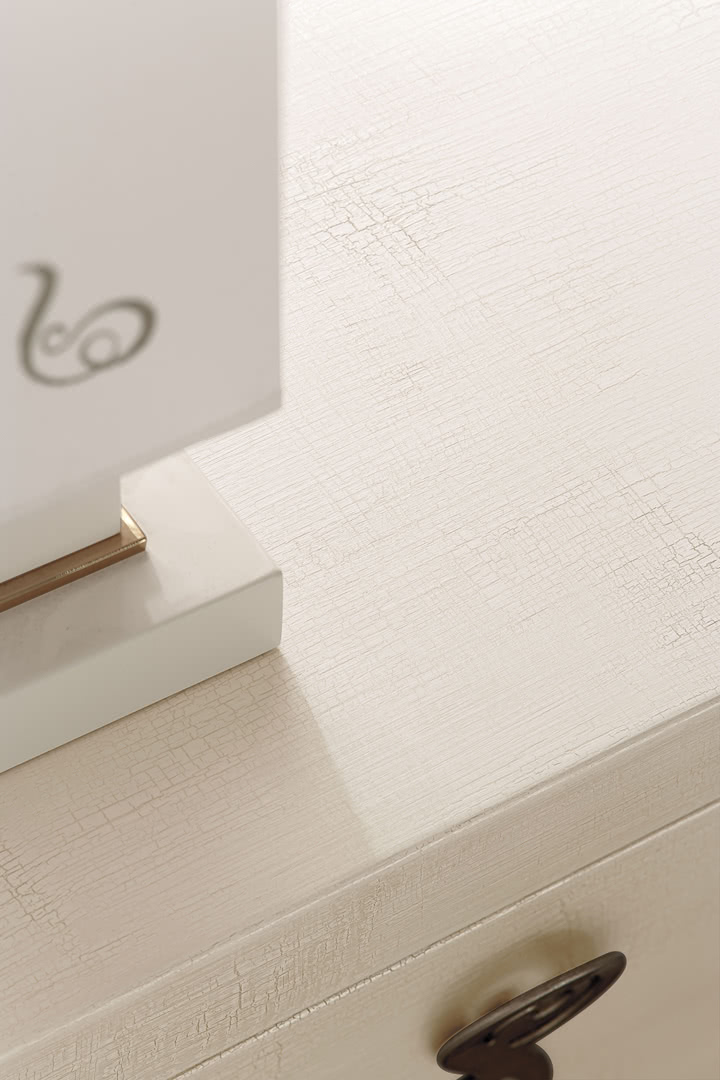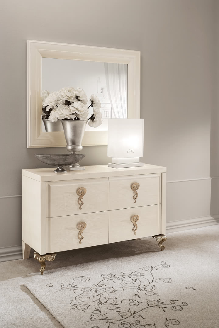 La struttura è realizzata in legno bugnato con forma squadrata; i cassetti, con guide ad estrazione totale e richiamo frenato, sono decorati a mano in madreperla anticato o spatolato. Le maniglie, in metallo tagliato a laser, sono finite in oro mentre i piedi, in fusione, sono decorati a mano in foglia argento champagne. Il comò George, insieme ai comodini, crea un gruppo notte perfetto per una camera da letto raffinata e dal design classico.