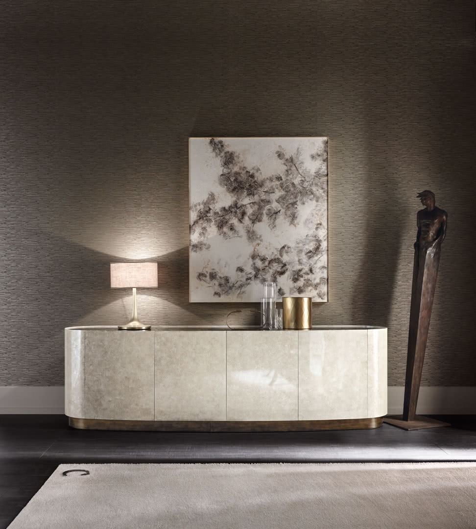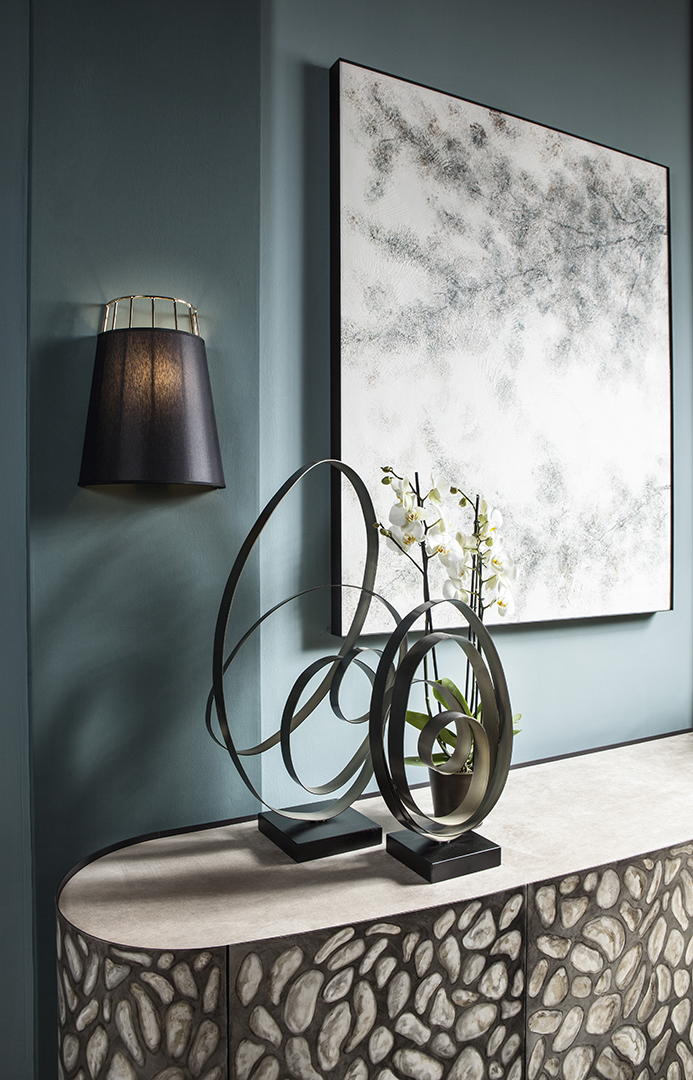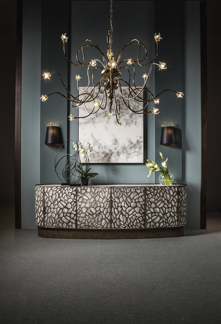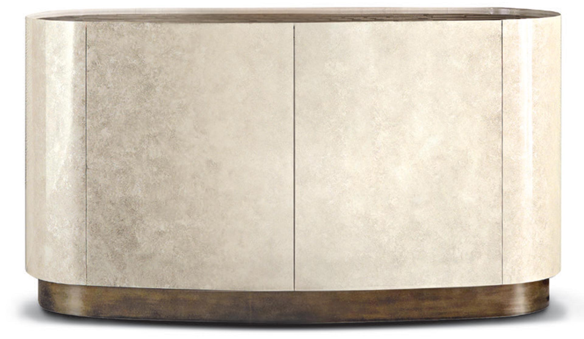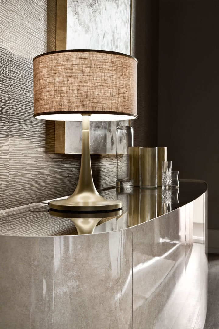Internamente è suddivisa da ripiani in vetro a filo lucido. Il top è in specchio fumé bronzo mentre i fianchi e le ante sono realizzate in metallo 2,5 mm tagliato a laser e curvato. La base è in ferro pieno curvato. Tutte le saldature sono a filo e a ottone interamente levigate a mano. Una linea essenziale dove risaltano le decorazioni Cantori, dal Seashell per un arredo classico al Decorato Tela, che lo adatta ad un ambiente dal design moderno.