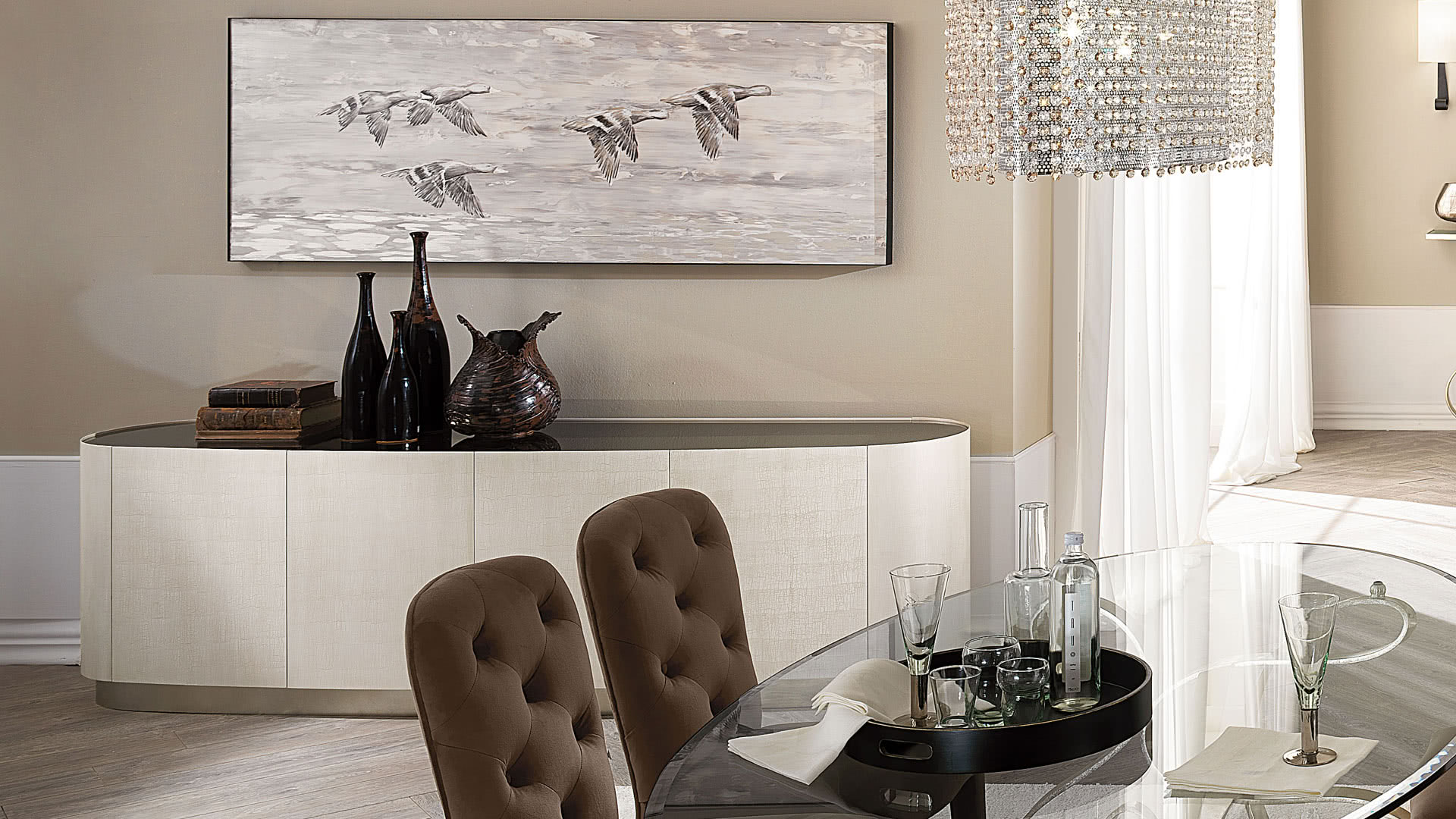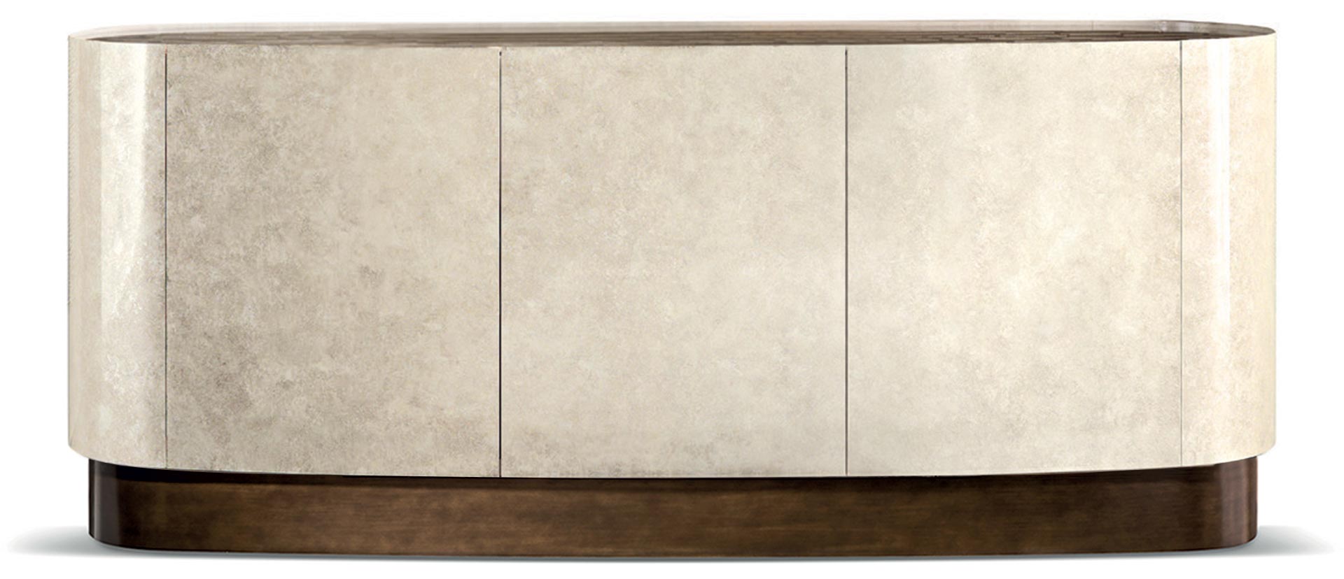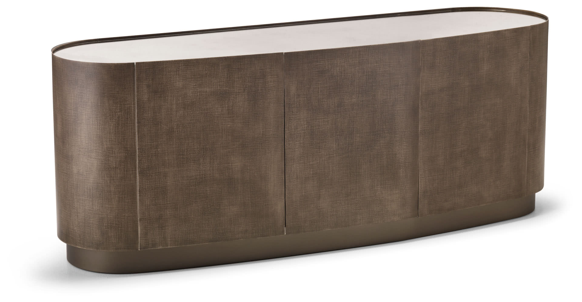 Internamente è suddivisa da ripiani in vetro a filo lucido. Il top è in specchio fumé bronzo mentre i fianchi e le ante sono realizzate in metallo 2,5 mm tagliato a laser e curvato. La base è in ferro pieno curvato. Tutte le saldature sono a filo e a ottone interamente levigate a mano. Una linea essenziale dove risaltano le decorazioni Cantori, dal Seashell per un arredo classico al Decorato Tela, che lo adatta ad un ambiente dal design moderno.