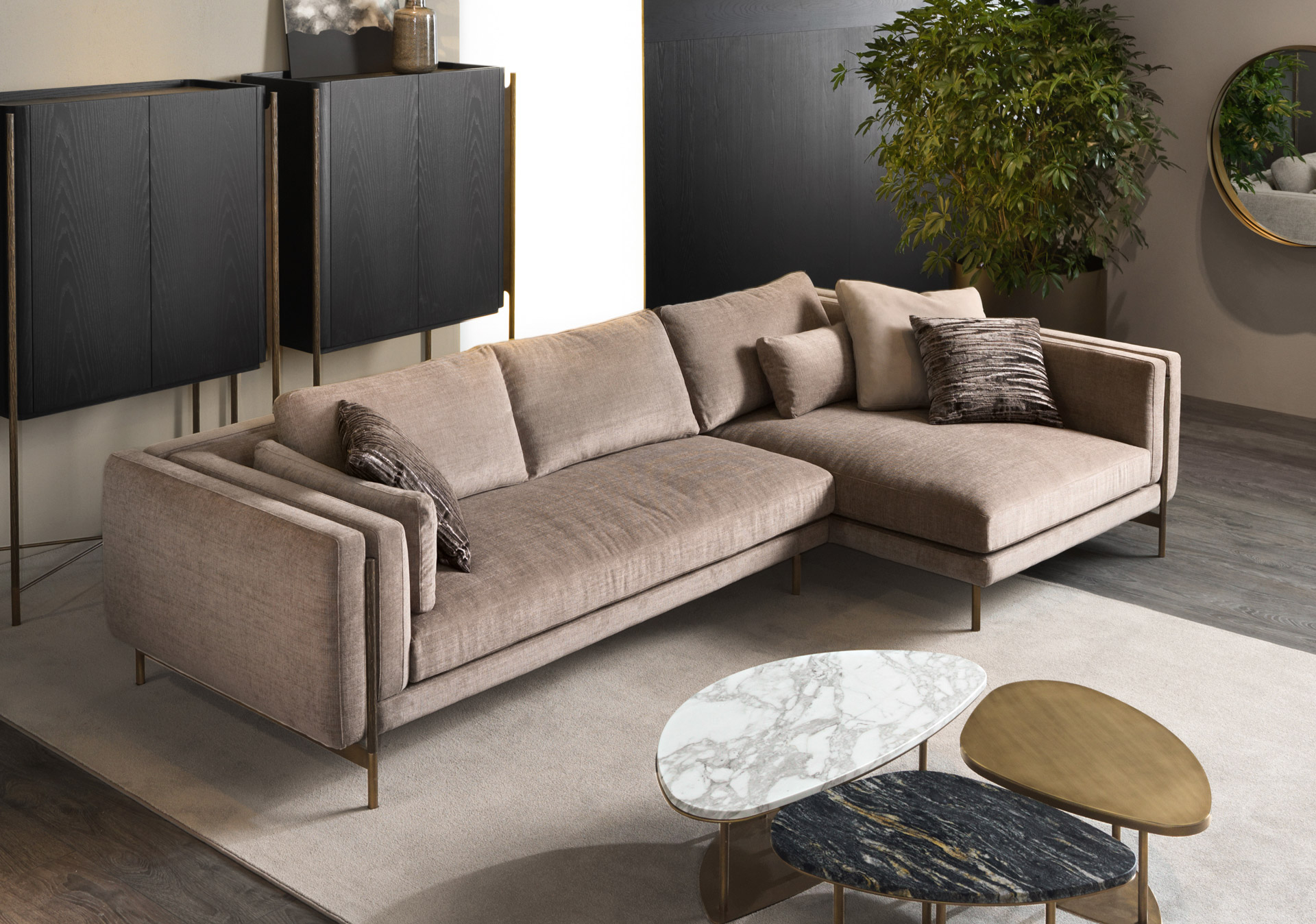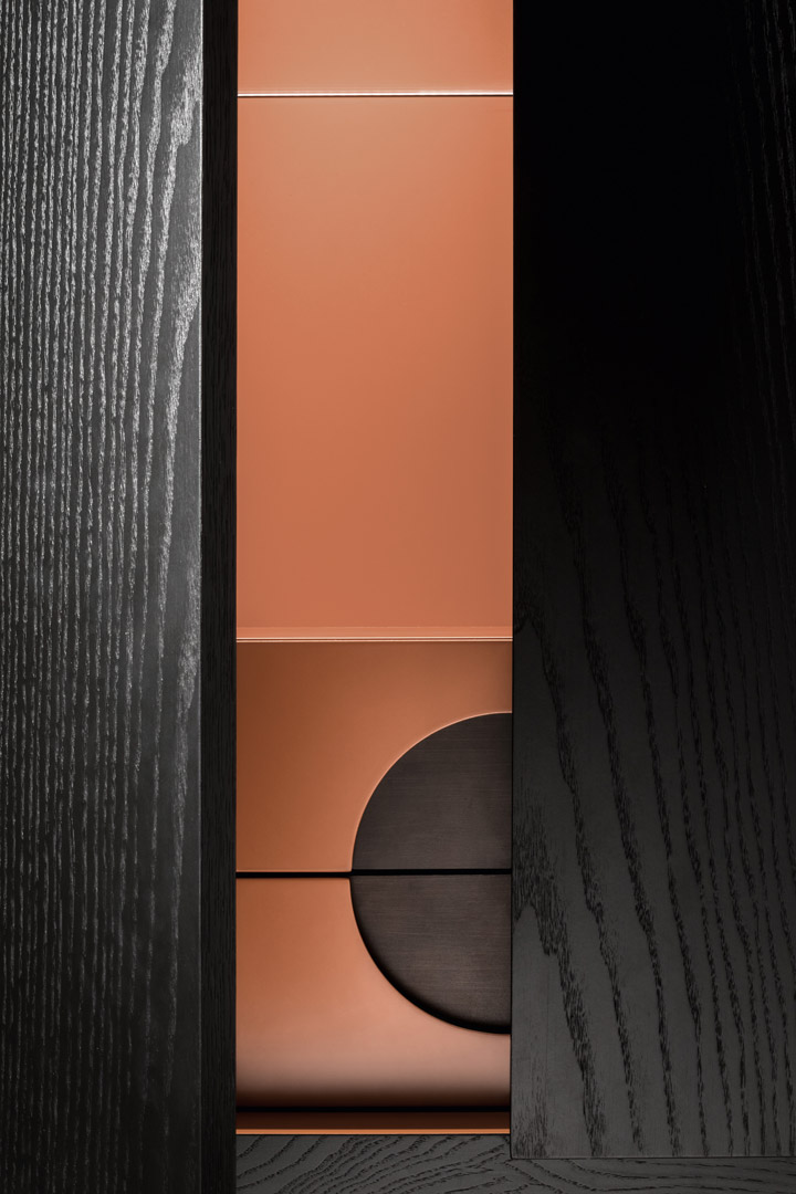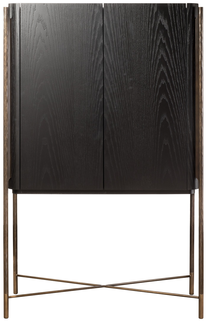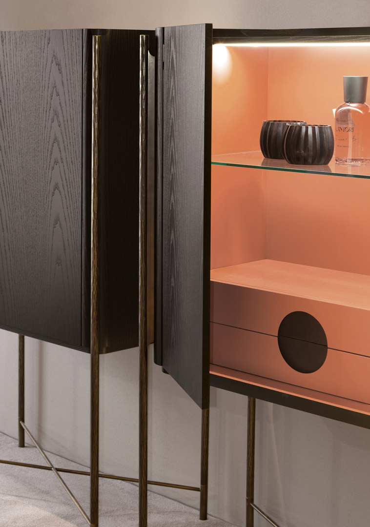 The structure is in wood refined with black ash wood or Italian walnut with vertical supports in forged and wrought metal which embellish the lines. The inside is divided with a shaped glass shelf and two drawers and is lacquered with a contrasting colour, making the compartment a sophisticated display unit with enhanced visual appeal once the doors are open. The two internal drawers have a metal integrated handle which creates a perfect circle, emphasising the refinement of each detail. A unit with a transversal and timeless design, capable of standing out in any setting, from the living area to the entrance area.