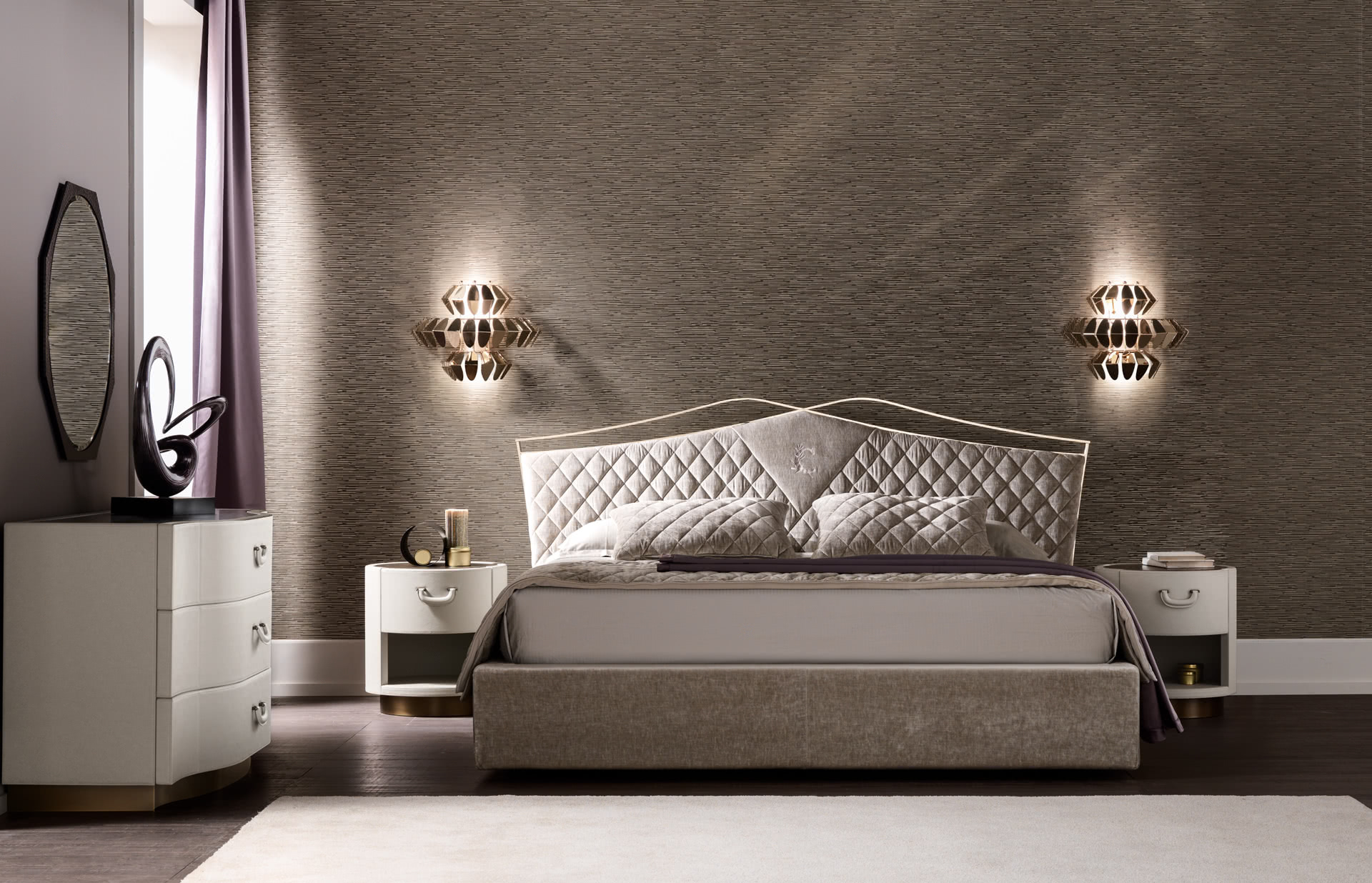 Il piano è sagomato e la base è realizzata in bronzo. Le maniglie dal sapore vintage, che ricordano le valige di lusso, sono rivestite in pelle con dettagli in metallo. Le forme sinuose e armoniose, insieme alla ricercatezza dei materiali e all'abbinamento con i comodini, creano un gruppo notte elegante e unico.