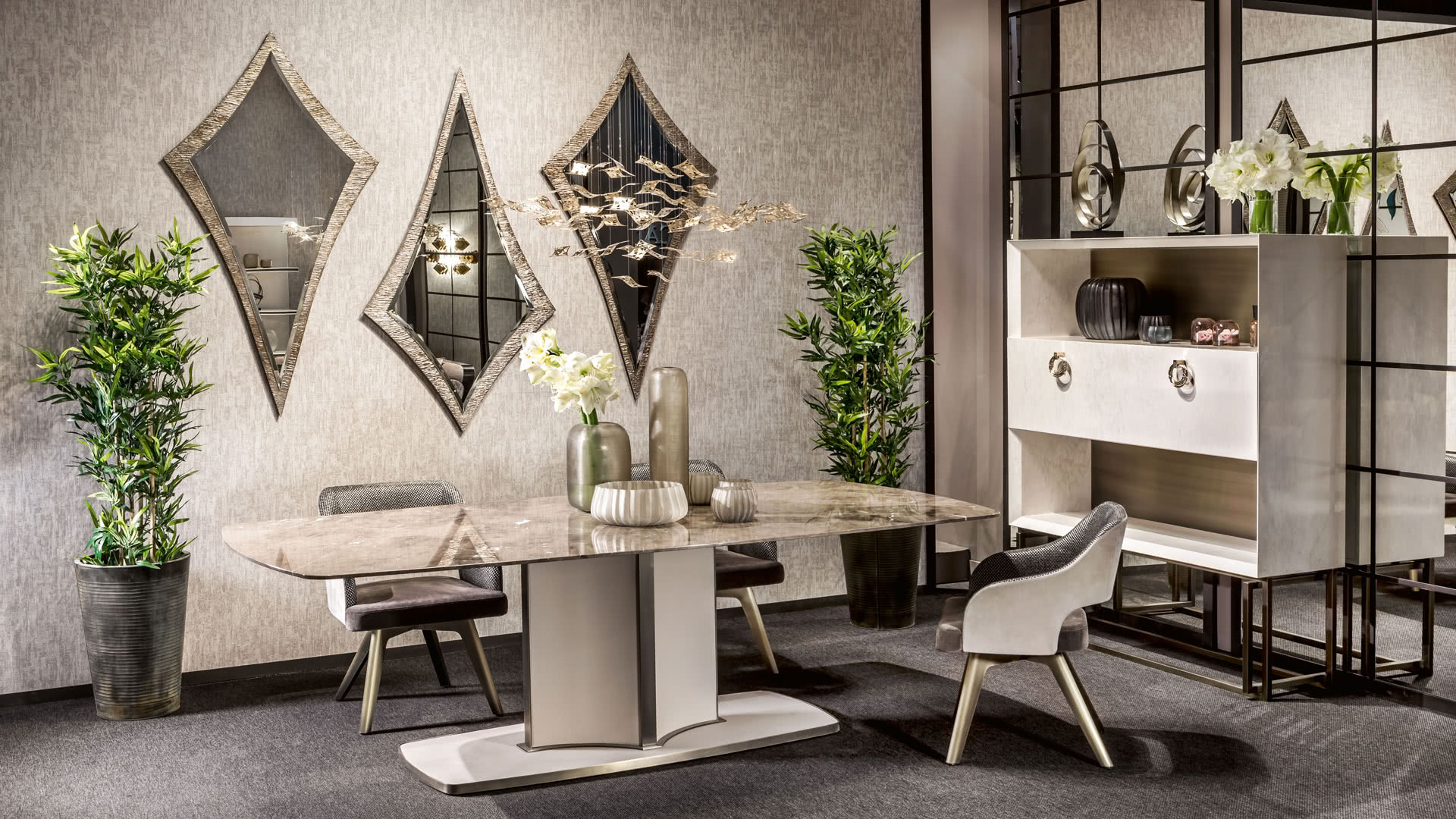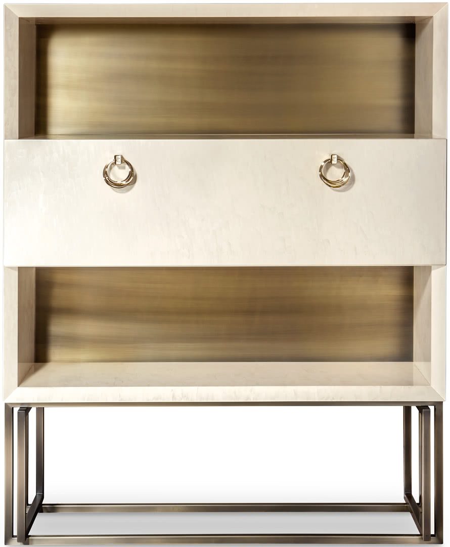 Base in brushed bronze finishing. The jewel-like handles in pale gold finishing are entirely handmade. Their shape draws inspiration from the doorknockers and bangle bracelets. The cabinet, with brushed finishing applied on a bronzed coat, is enriched by these elements. The handles, in fact, soften its squared lines and its rigourous design.