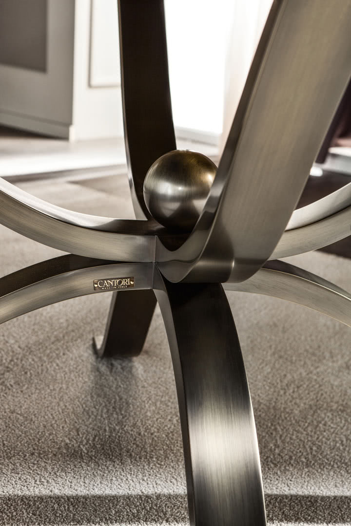 Il top in vetro è disponibile in vetro trasparente o bronzato con bordo molato o a filo lucido. La struttura portante, realizzata in ferro pieno, viene rastremata, curvata a freddo e lucidata a mano.