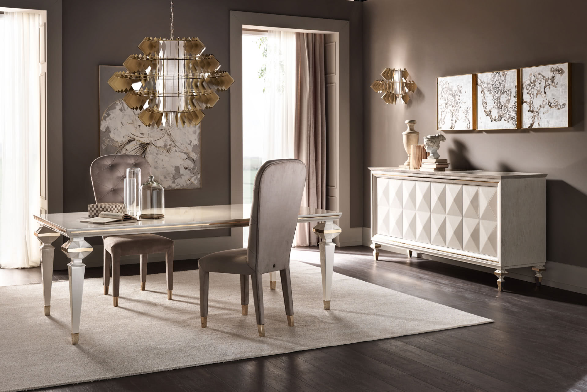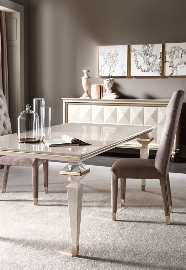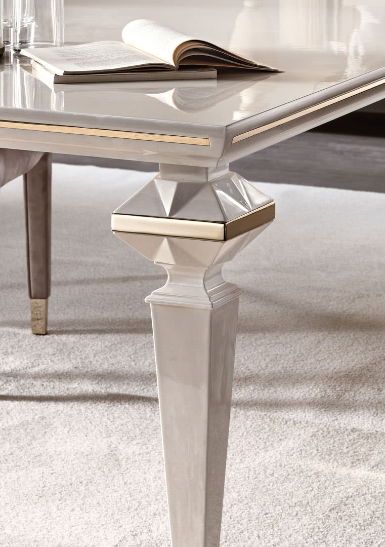 I piedi in legno, che sostengo il piano, sono modellati con taglio a diamante per formare un gioco di facce e di luce, sottolineato dagli inserti in oro, e ripreso anche nel piano in legno sagomato. La decorazione in madreperla spatolato, realizzata a mano, ne esalta l’anima classica.