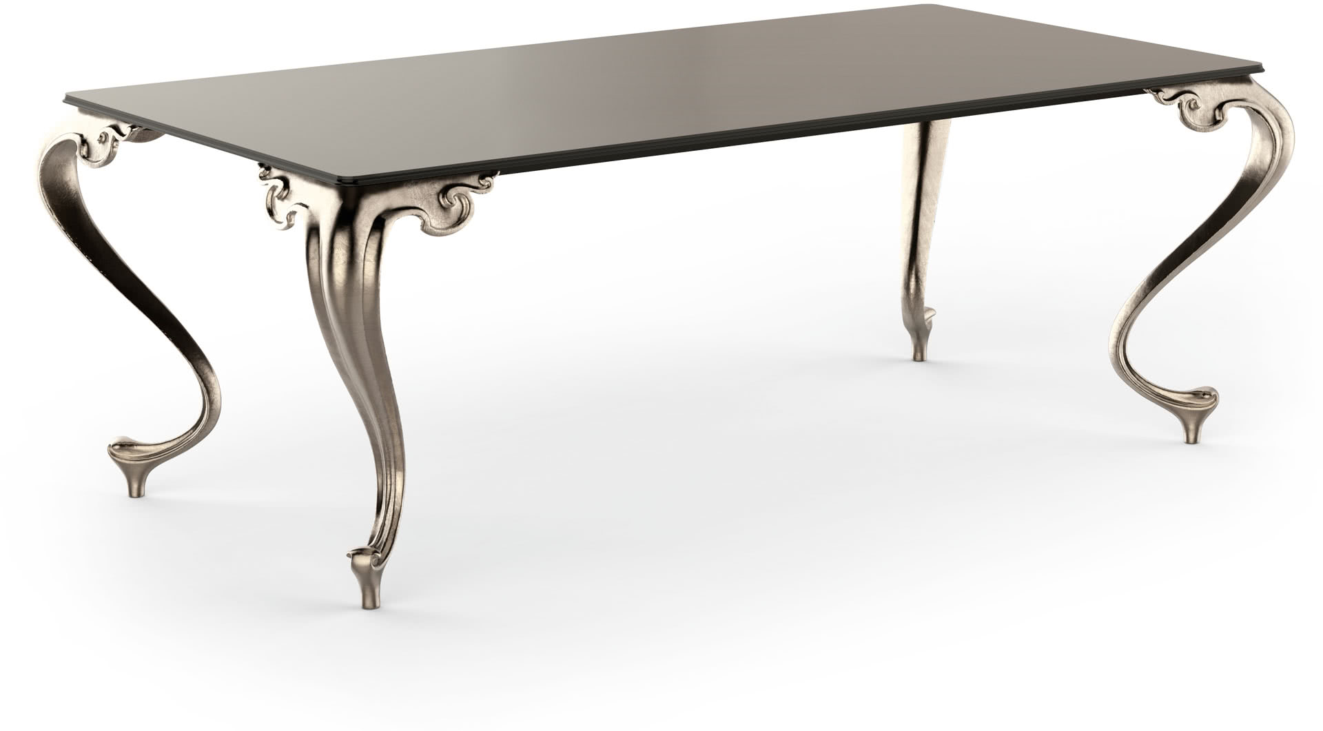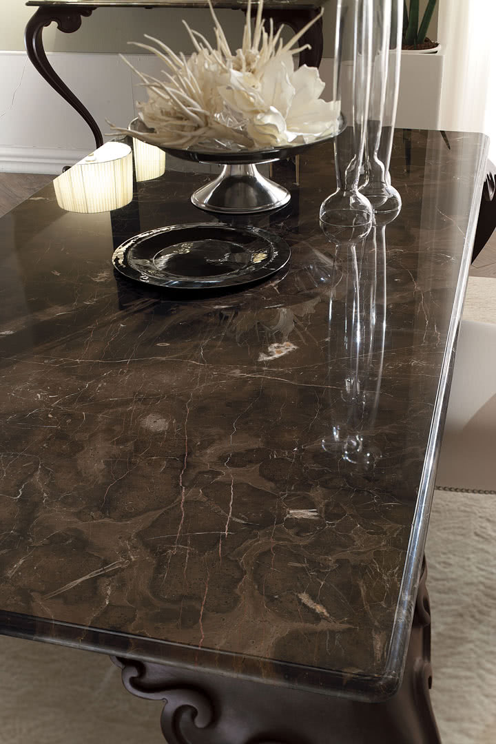 Tavolo classico in vetro o in marmo George con piano rettangolare e gambe in fusione d’alluminio.