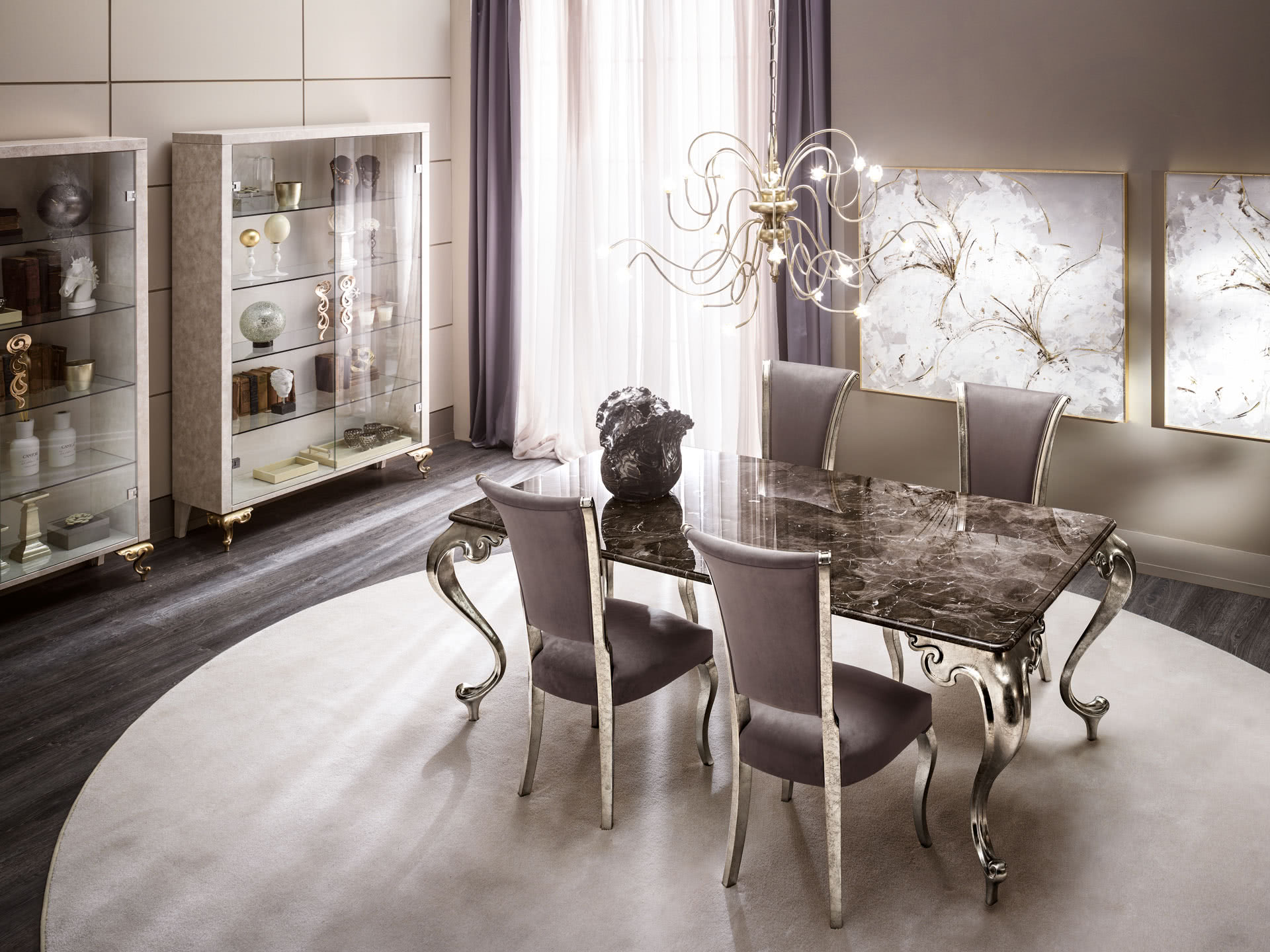 Il top può essere realizzato in marmo, sagomato e levigato, o in vetro bronzato fumè, accoppiato ad uno specchio bronzato a doppia argentatura, con profili sagomati. I piedi sono levigati manualmente.