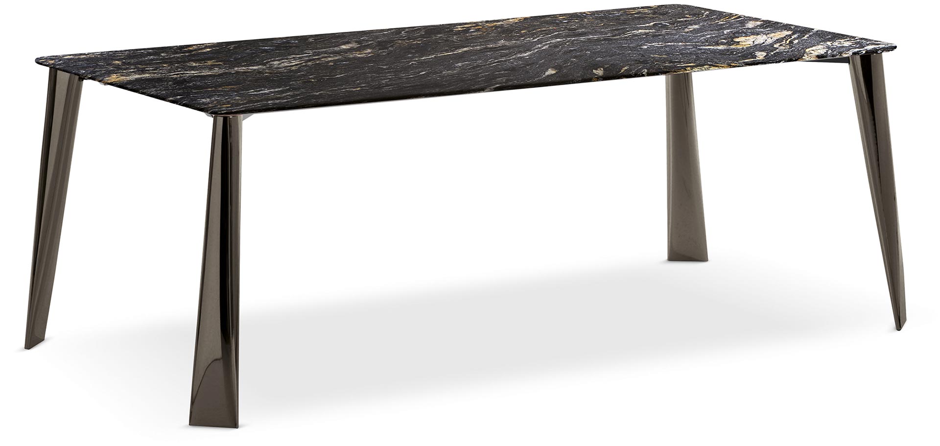 I piedi in metallo, modellati e levigati manualmente, sono schiacciati alla base in modo da slanciare e alleggerire il piano in marmo o in ceramica. Linee e materiali moderni per un tavolo dal design lineare.