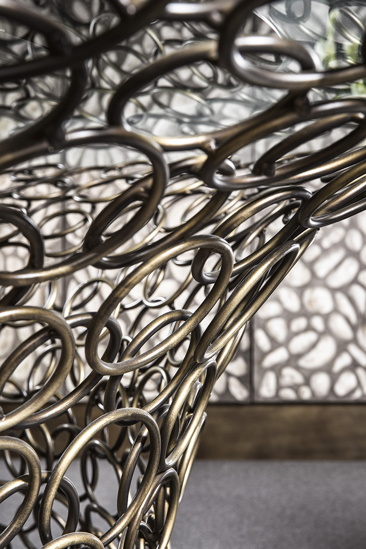 Il piano in vetro molato a filo lucido, è disponibile nella versione trasparente o fumé bronzo. La base è realizzata con tondini in ferro pieno che, saldati tra loro uno ad uno, si fondono tra loro a formare un vortice di cerchi. Questi vengono trafilati, curvati e levigati manualmente. La decorazione, la patinatura e la posa della foglia sono realizzate completamente a mano. La finitura è realizzata a bagno di galvanica in oro o in nichel nero.