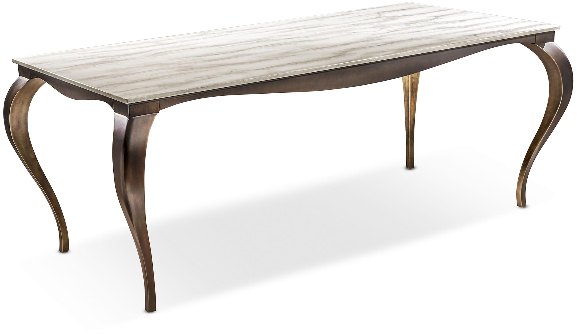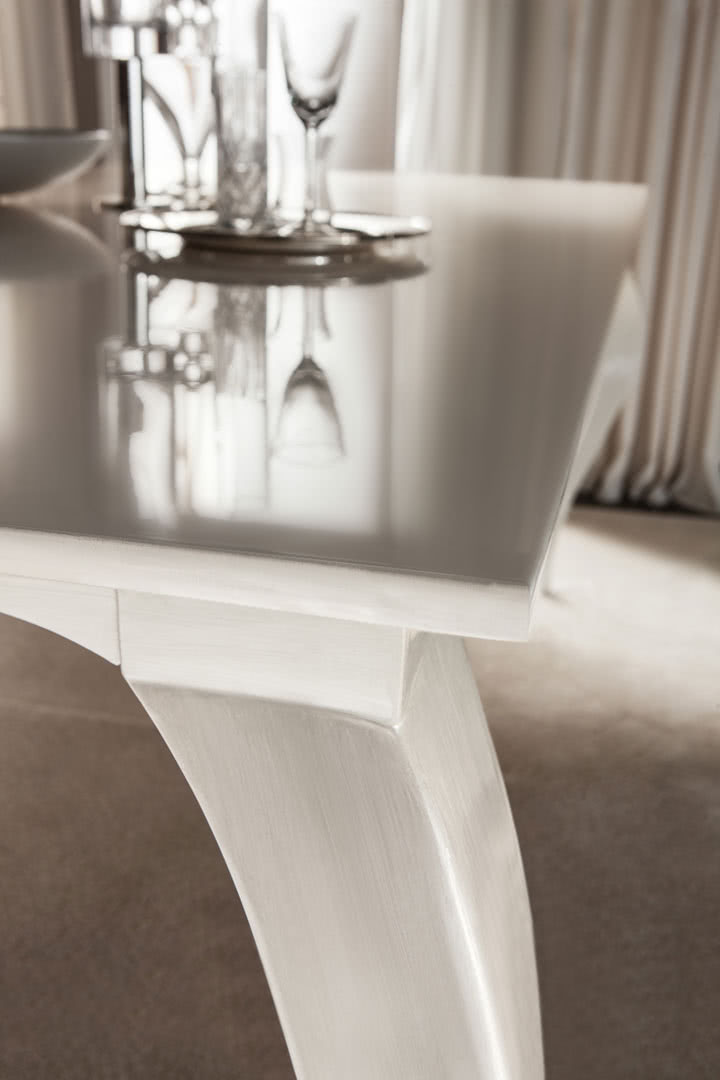 Il top è disponibile in legno decorato a mano o in vetro serigrafato e molato a filo lucido. Il telaio, in metallo, è tagliato al laser e curvato. La saldatura dei componenti della base viene effettuata a filo e levigata a mano.