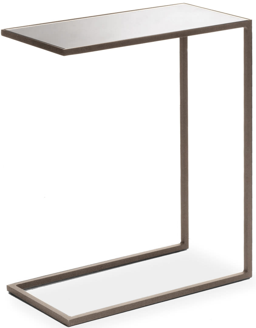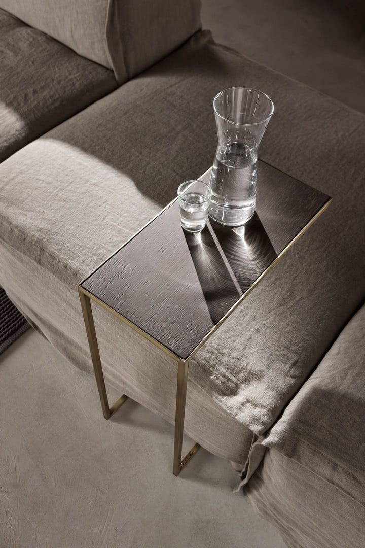 La struttura è in ferro pieno quadro con finitura a bagno di galvanica in ottone spazzolato, nichel nero o in ferro metallizzato. Il top è rivestito in specchio bronzato a filo lucido. Un design moderno dalle linee pulite per un tavolino che si introduce nel sofà per diventare un comodo supporto o un tavolino lato sofà.