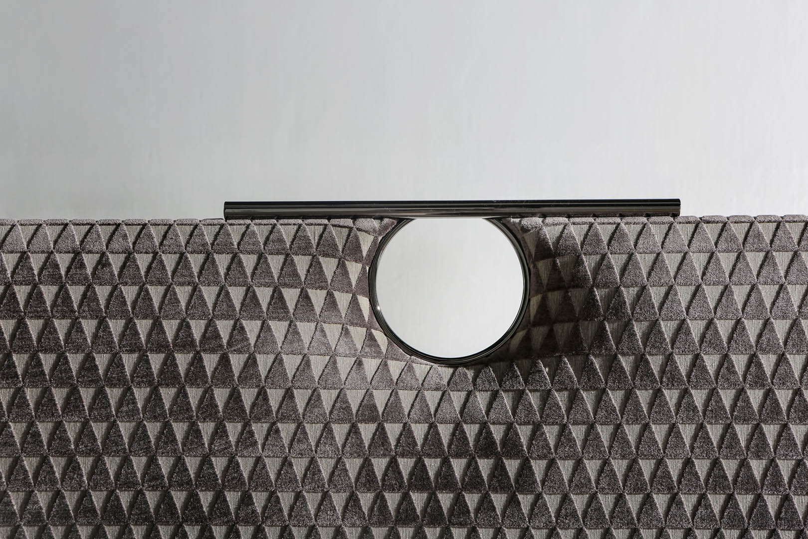 Il dettaglio in metallo spezza la semplicità del letto imbottito rendendolo più elegante; la testata e il giroletto sono imbottiti e rivestiti, o impunturati se in pelle, anche in tessuto/pelle fornito dal cliente (il giroletto è sfoderabile). Il letto Bay, con la linearità del design, dona un carattere unico alla camera da letto moderna; è disponibile in varie dimensioni per reti da cm: 160x200 (letto matrimoniale), 180x200 (letto matrimoniale) e 200x200 (letto king size) anche nella versione con box contenitore.