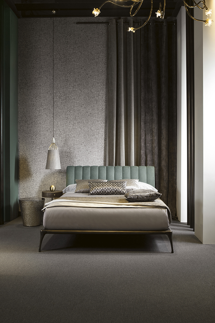 La struttura perimetrale e i piedi sono in fusione di alluminio, decorati in bronzo; la testata imbottita, con trapuntatura verticale, è rivestita con velluto, tessuto, pelle, ecopelle o con tessuto/pelle fornito dal cliente. Un’aura vintage che rende accogliente l’intera camera da letto. Il letto Iseo è disponibile in varie dimensioni per reti da cm: 120x200 (letto da una piazza e mezzo), 140x200 (letto alla francese) e 160x200 (letto matrimoniale).