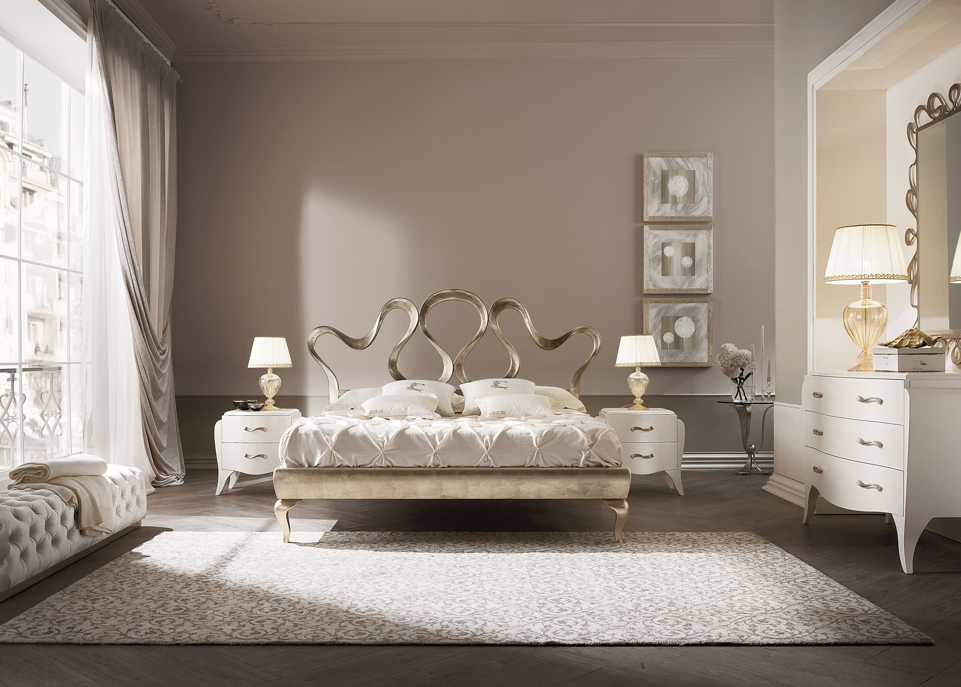 La testata ha un movimento tridimensionale in fusione di alluminio, completamente levigato, lucidato e finito a mano in foglia argento champagne; presenta un pannello imbottito e rivestito all’altezza dell’appoggio del cuscino. Le fasce del giroletto sono realizzate in legno massello sagomato e decorato. Il letto Nastro è perfetto per una camera dal design classico e internazionale; è disponibile in varie dimensioni, con o senza pediera, per reti da cm: 160x200 (letto matrimoniale) e 180x200 (letto matrimoniale) anche nella versione con box contenitore.