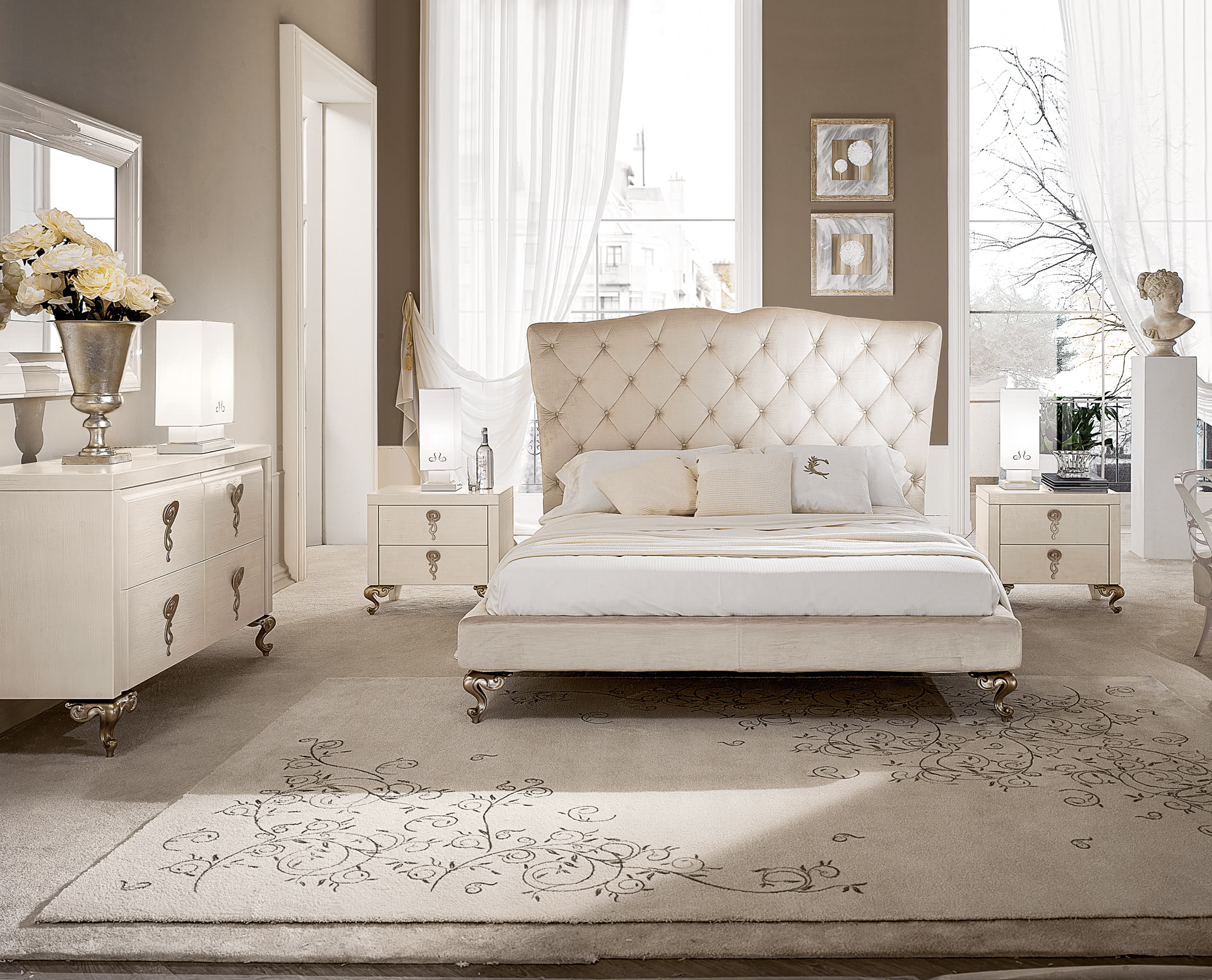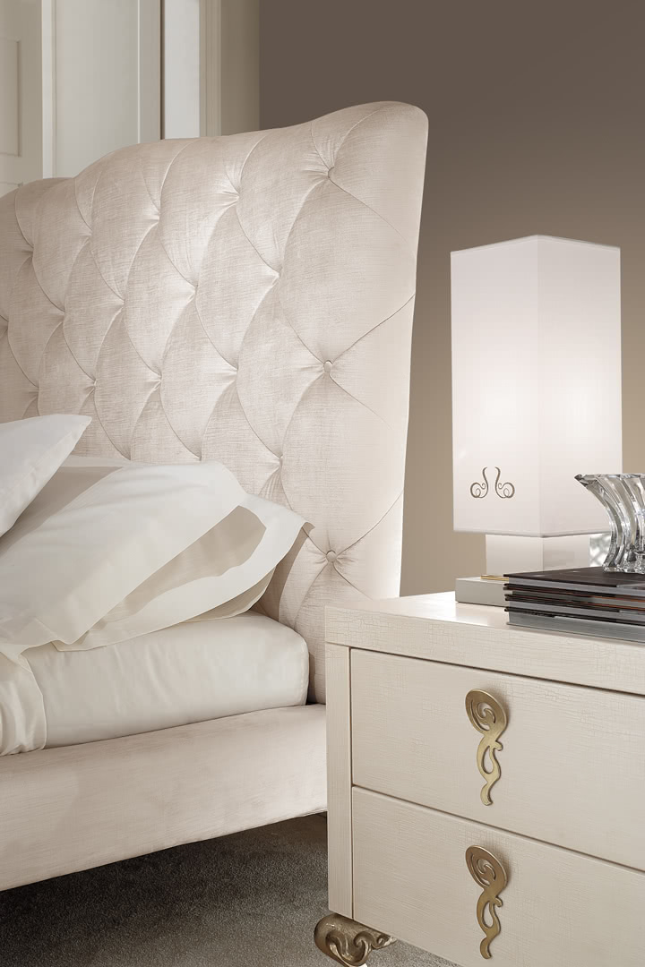 La struttura è realizzata in legno bugnato con forma squadrata; i cassetti, con guide ad estrazione totale e richiamo frenato, sono decorati a mano in madreperla anticato o spatolato. Le maniglie, in metallo tagliato a laser, sono finite in oro mentre i piedi, in fusione, sono decorati a mano in foglia argento champagne. I comodini George, insieme al comò, creano un gruppo notte perfetto per una camera da letto raffinata e dal design classico.
