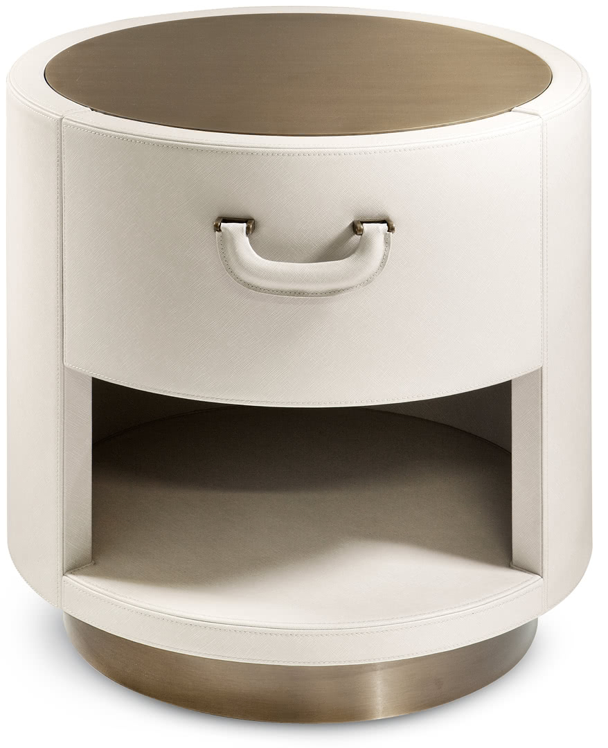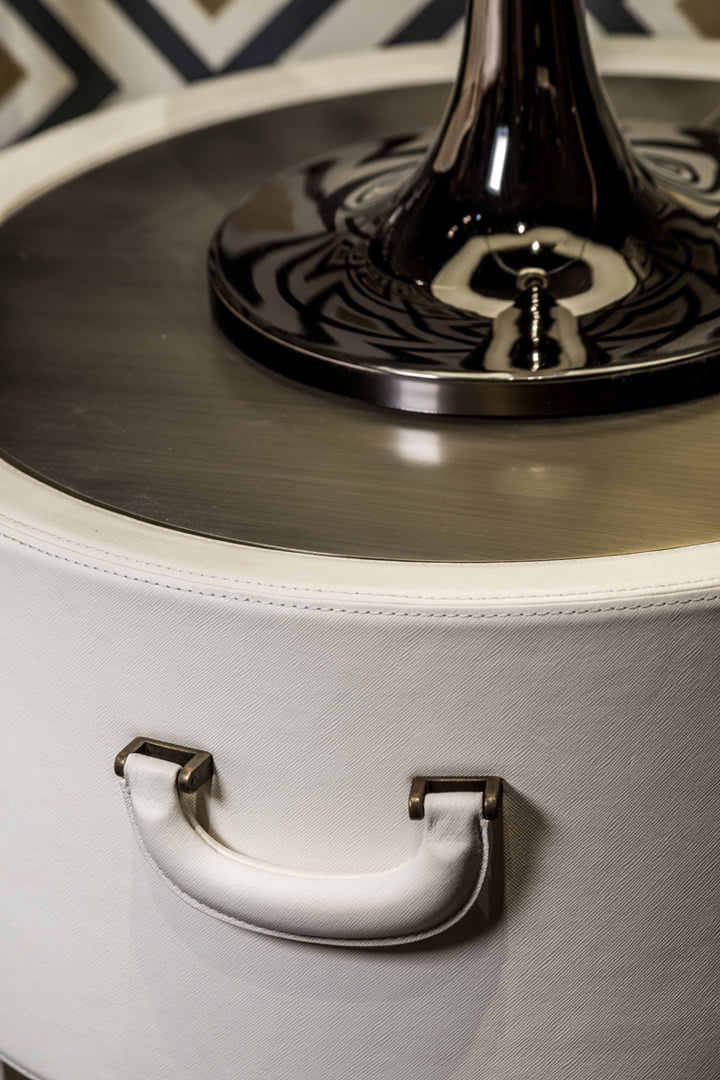 Il piano è sagomato e la base è realizzata in bronzo. La maniglia dal sapore vintage, che ricorda le valige di lusso, è rivestita in pelle con dettagli in metallo. Le forme sinuose e armoniose, insieme alla ricercatezza dei materiali e all'abbinamento con il comò, creano un gruppo notte elegante e unico.