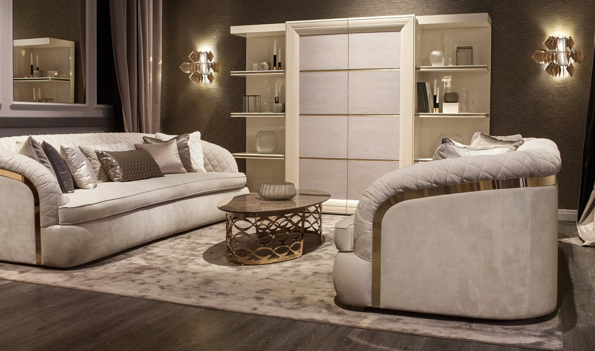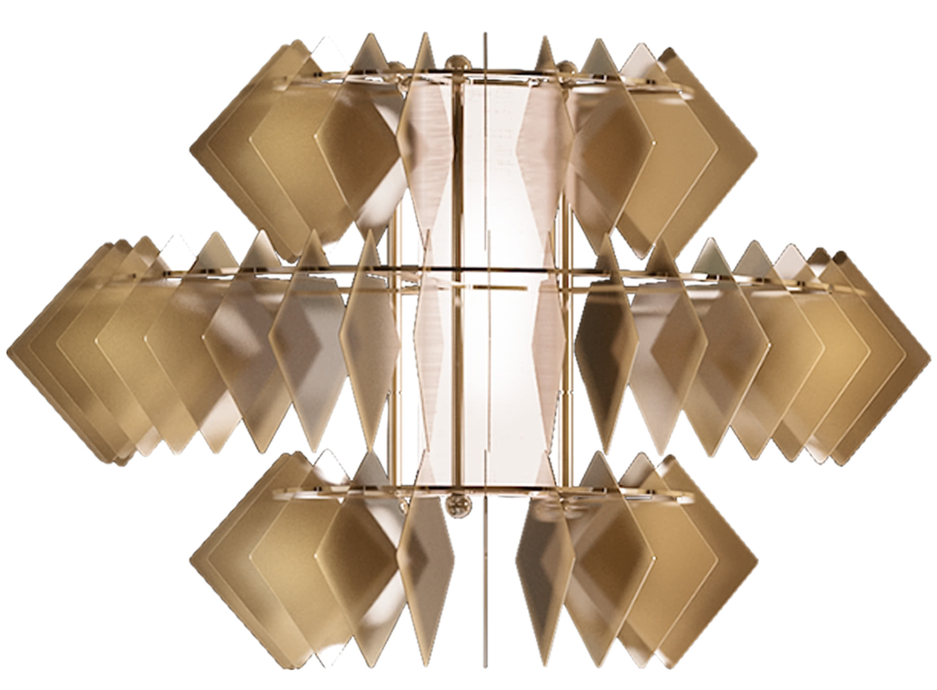 La struttura, in finitura galvanica oro, sostiene dei pendenti romboidali mobili, in acciaio finiti in oro; il paralume interno è realizzato in tessuto per diffondere una luce sobria ma ricca di sfumature. I giochi di riflessi sulle foglie dorate illuminano le stanze e fanno di queste luci il centro focale dello spazio, sia in camera da letto che in sala da pranzo. La nuova collezione di lampade Diamante New comprende il lampadario a 5 e 3 castelli, la lampada da parete e la lampada da tavolo.