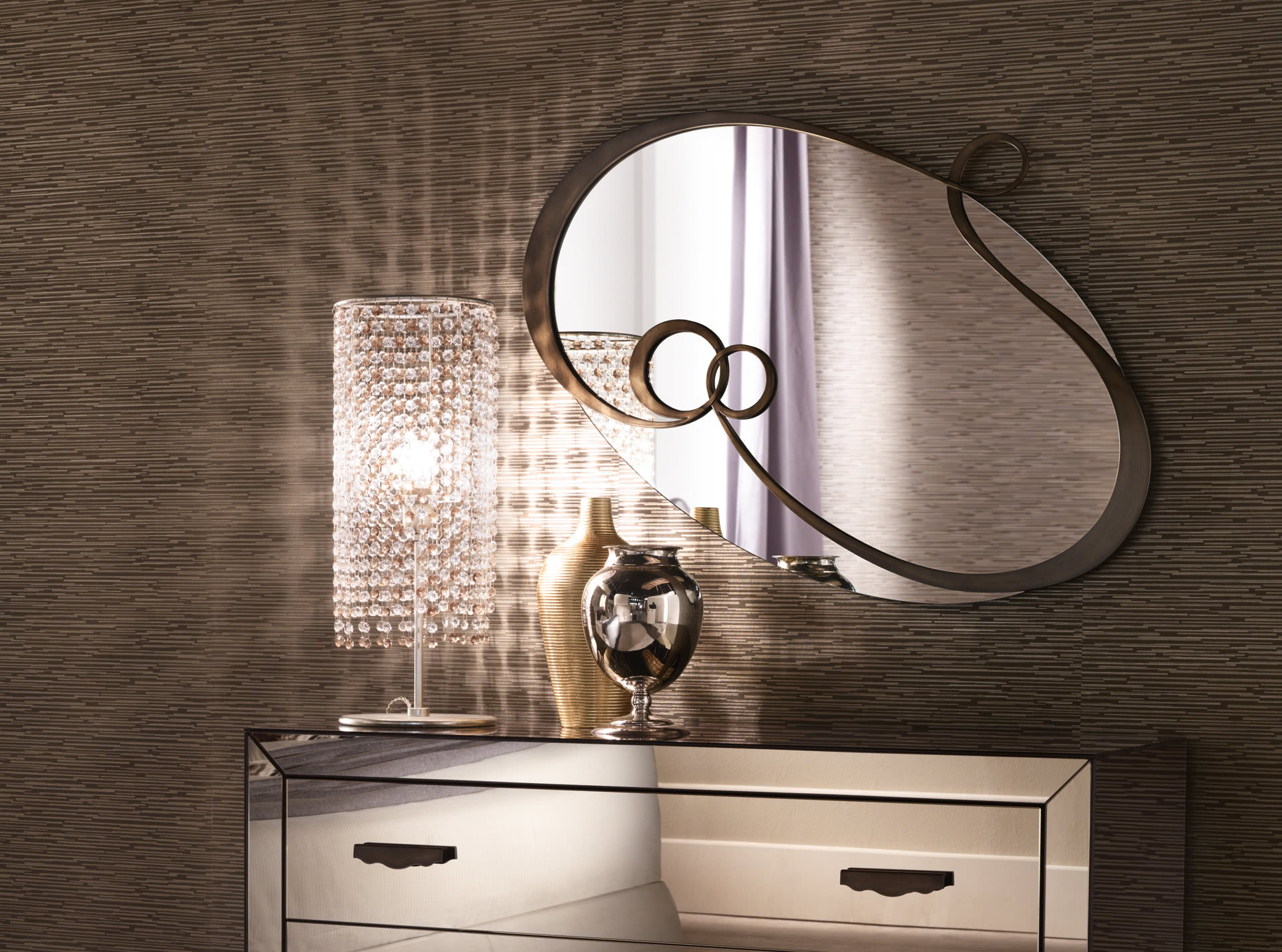 La struttura è finita in foglia argento champagne, realizzata a mano; il paralume, realizzato con pendenti di vetro a due colori tagliati diamante e montati a mano, regalano un gioco di luci unico alla sala e alla camera da letto. Una lampada da tavolo dal gusto eclettico, perfetta sia per un arredamento classico che moderno.