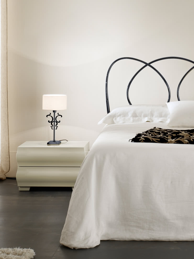 La struttura è in acciaio, tagliato a laser, finita in oro, madreperla, nichel o nichel nero; il paralume a cilindro è realizzato in lino accoppiato e autoestinguente. Una lampada da comodino perfetta per una camera da letto, una sala o un ingresso dal sapore internazionale e sofisticato.