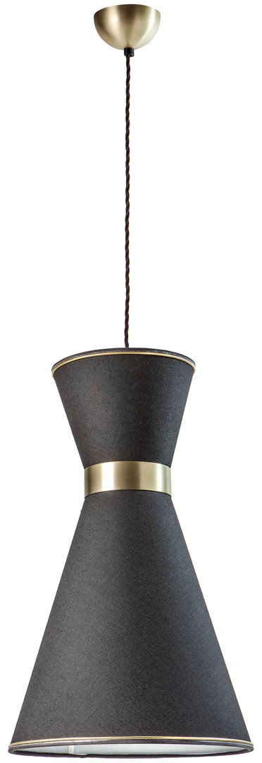 La struttura, con fascia di attacco a paralume, è realizzata in ferro, curvato e sagomato, con finitura in nichel nero o oro; il paralume fisso, in lino, ha la forma di due tronchi di cono accoppiati. Un design moderno per un lampadario eclettico, perfetto in un bar, una hall, sopra ai comodini in una camera da letto o in coppia sopra un tavolo da pranzo.