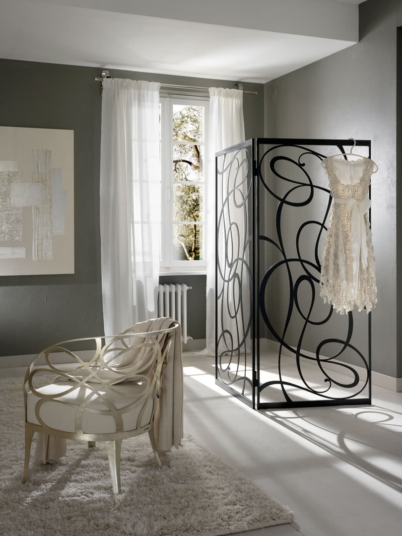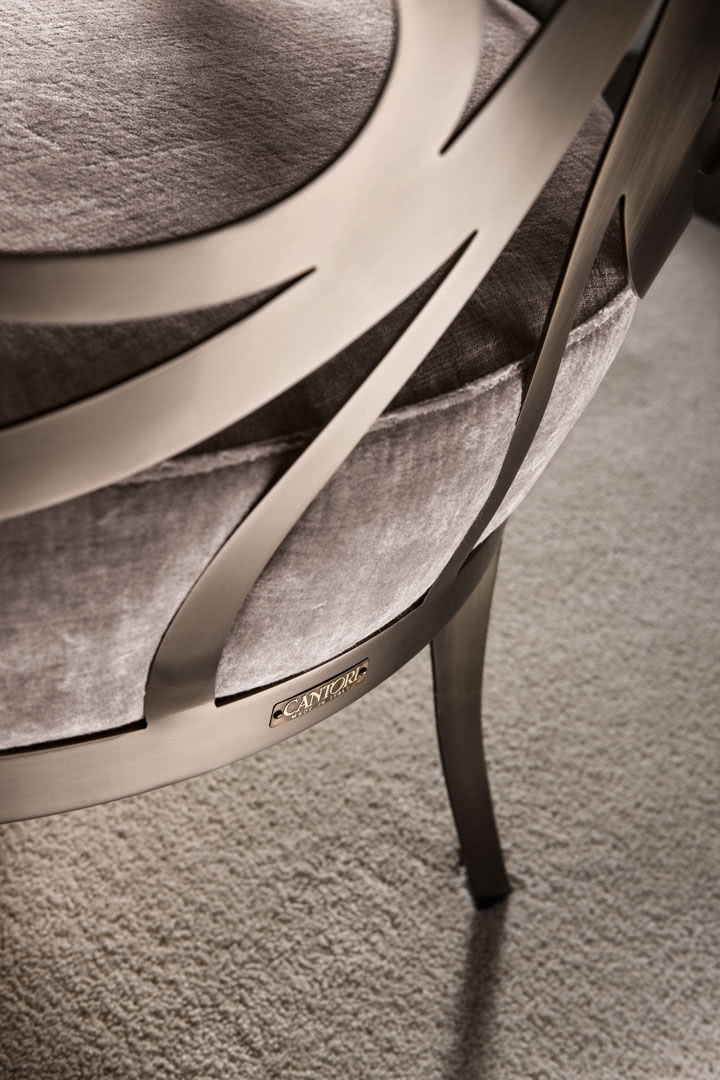 La base e lo schienale sono realizzate in ferro pieno, curvato e tagliato a laser per formare un disegno a ghirigori dalle forme sinuose e dal sapore classico. La seduta in legno è imbottita in gomma a due densità e rivestita sartorialmente in tessuto, velluto, pelle o con un tessuto fornito dal cliente (sfoderabile).