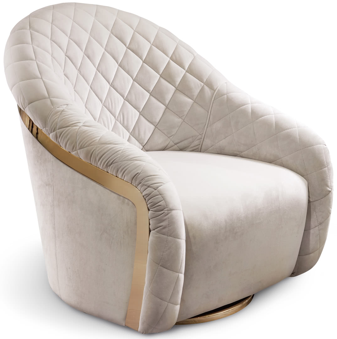 La base in metallo girevole è munita di sistema di rientro in posizione. La fascia decorativa in oro o bronzo ne esalta le curve. L’imbottitura e trapuntatura sono realizzate interamente a mano in tessuto, velluto, pelle o con tessuto/pelle fornito dal cliente. Una poltrona elegante dalla forma sinuosa e con uno schienale avvolgente che regala un comfort totale.