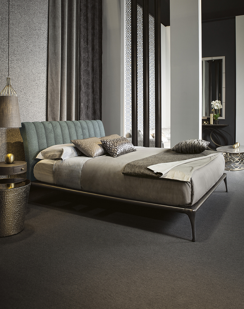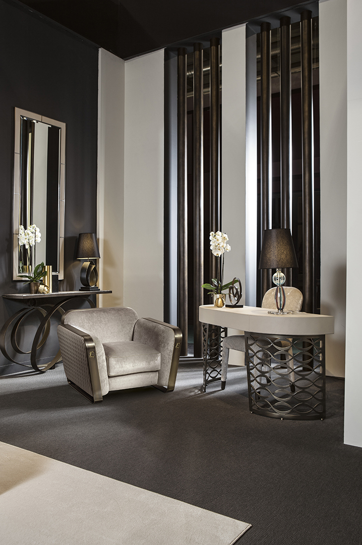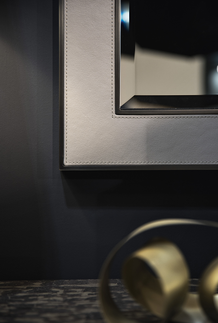 Lo specchio è argentato a doppio fondo. Il telaio, in ferro pieno decorato a mano o in bagno di galvanica bronzo, fa da cornice agli inserti rivestiti in pelle, pelle saffiano o con una pelle fornita dal cliente, e impunturati. La specchiera Amelia è disponibile in due diverse dimensioni e con possibilità di aggancio a parete orizzontale e verticale.