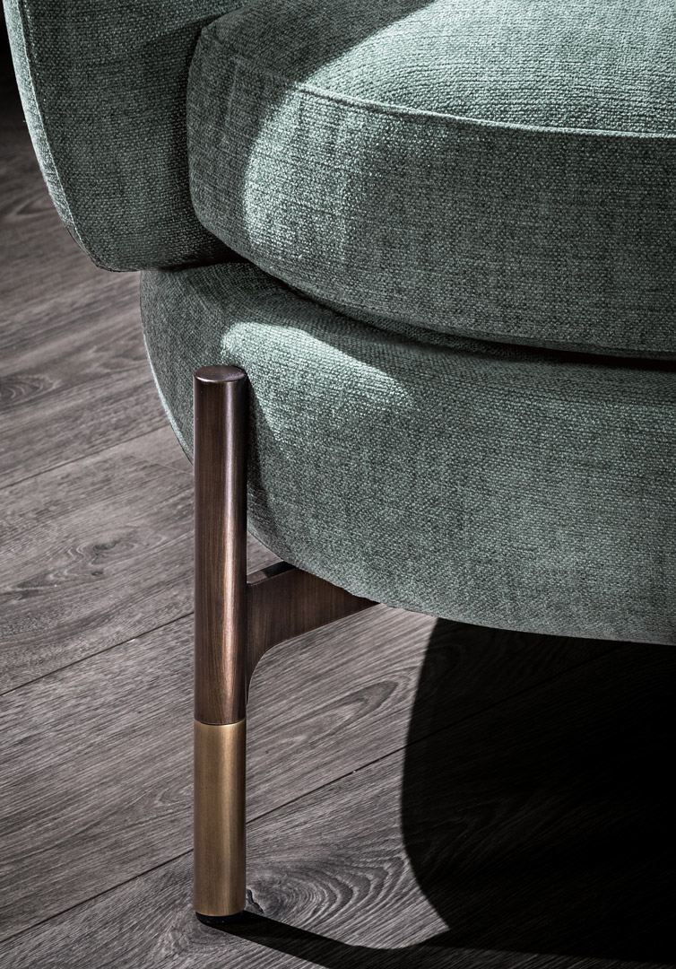 La struttura è in legno massello in faggio e pioppo con inserti in multistrato, il molleggio è garantito da cinghia elastiche indeformabili. Il rivestimento strutturale è in poliuretano espanso a quote differenziate ad alta densità e lo strato superiore ad alta componente elastica, la cuscinatura è a densità differenziata indeformabile in piuma e falda sintetica. I piedi dal design minimal sono in ferro pieno e sostengono la seduta con leggerezza. Un divano lineare dall’aura vintage, pulita e senza tempo, che rende accogliente l’intero living da solo o in coppia.
