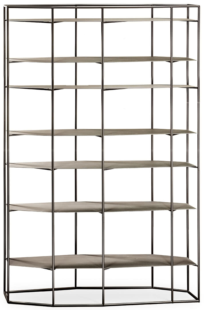 La struttura portante, montata ad incasso, in tondino di metallo è disponibile in oro, rame, ottone o nero seppia. Le mensole sagomate sono realizzate in ferro metallizzato. La libreria Diadema è disponibile in diverse altezze per riempire tutta la parete fino al soffitto perfetta anche come centro stanza per dividere un moderno openspace.