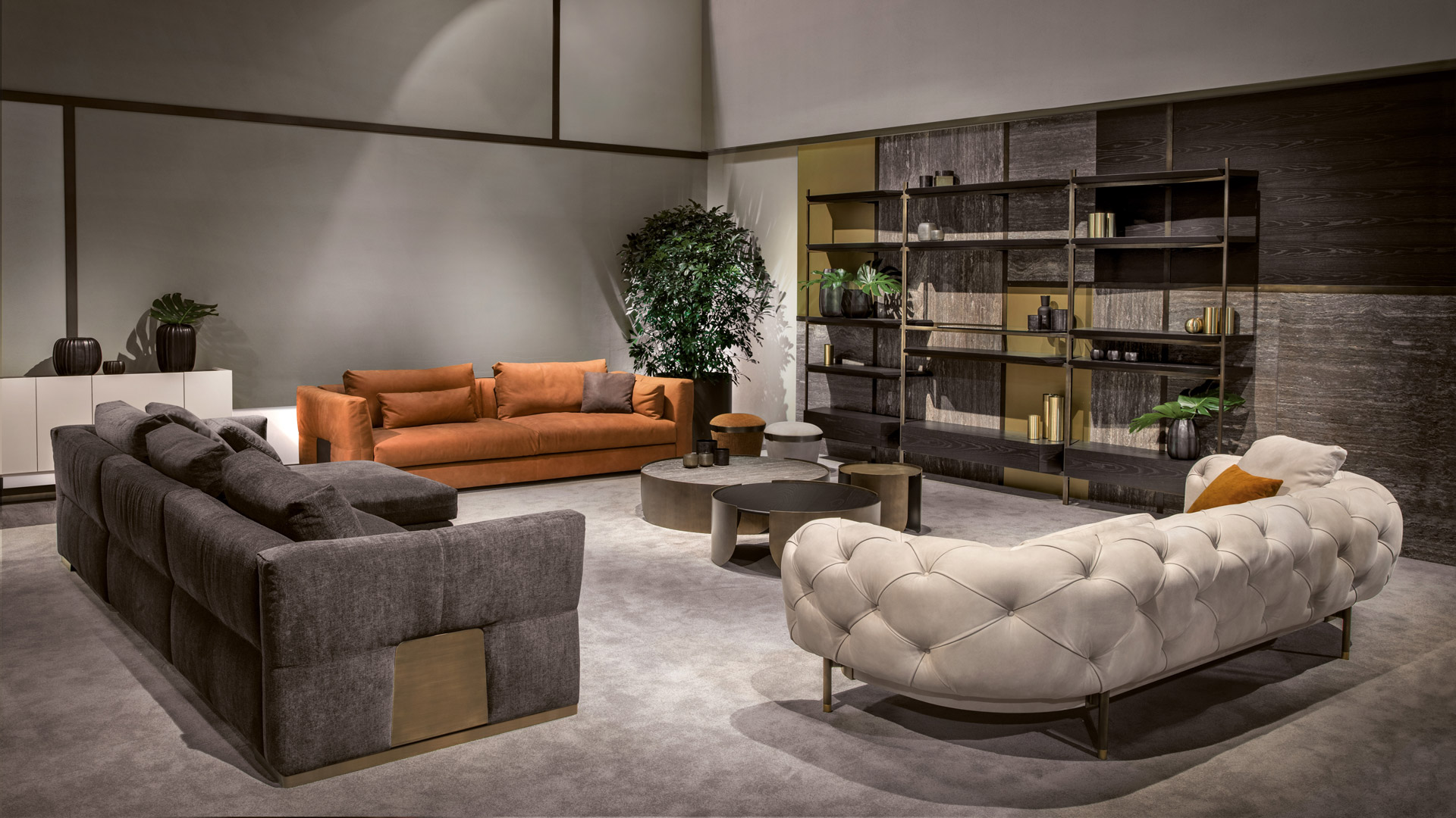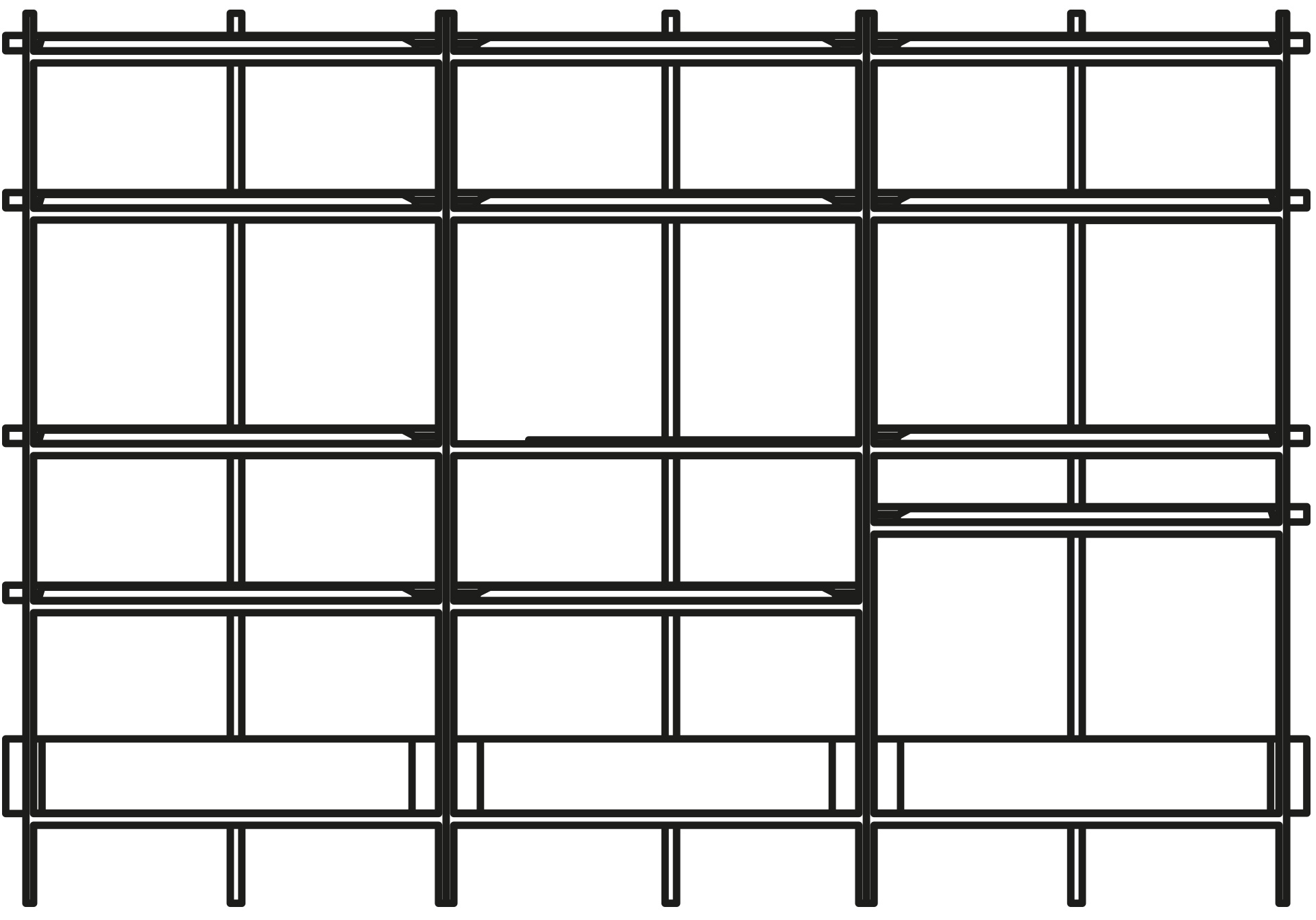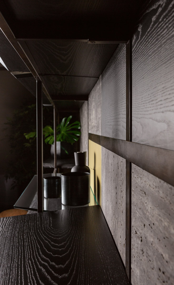 La struttura portante è in metallo di sezione quadrata con rifinitura bronzo patinato. I ripiani possono essere in legno di frassino nero e noce nazionale, in vetro e in marmo con cassetti a estrazione totale. Le mensole si incastrano l’una con l’altra creando giochi di geometrie e di luci riflesse da materiali diversi e preziosi. Con la sua struttura lineare e componibile, è perfetta anche come parete divisoria all’interno di un open space.