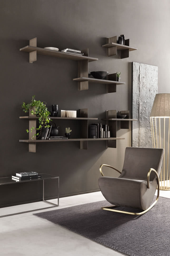 Sistema di libreria componibile, da appendere a parete, formata da mensole in legno massello, disponibili in quattro diverse lunghezze, e supporti con uno o due vani per ripiani, realizzabili in ottone spazzolato o ferro patinato. Finiture ricercate e materiali forti per una libreria che diventa un disegno grafico decorativo.