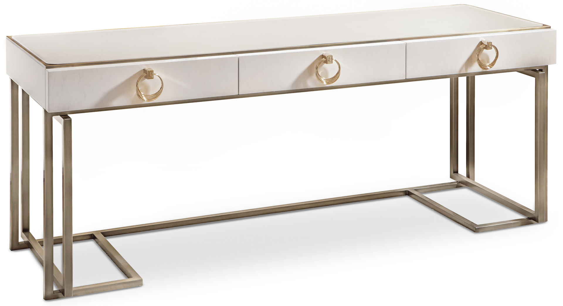 La base è finita in bronzo mentre il piano removibile è in legno rivestito in pelle. Le maniglie gioiello, finite oro pallido, sono realizzate interamente a mano e prendono ispirazione dai battenti delle porte e dai bracciali a più giri; inoltre impreziosiscono ulteriormente la finitura spatolata e la base bronzata della scrivania, ammorbidendone le linee squadrate dal design rigoroso.