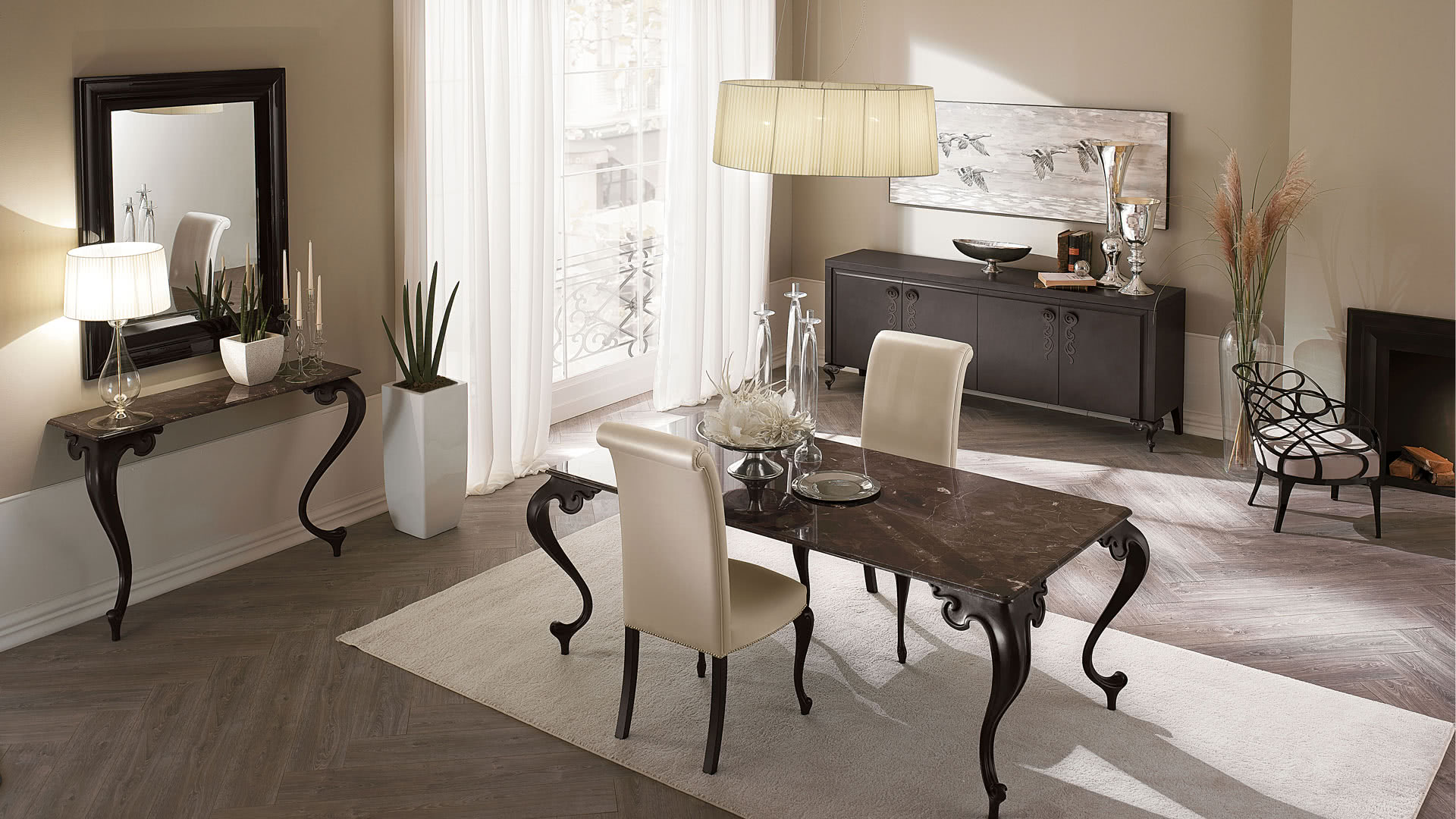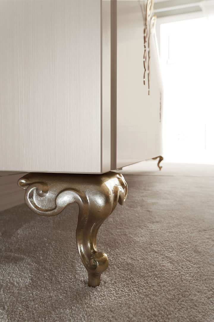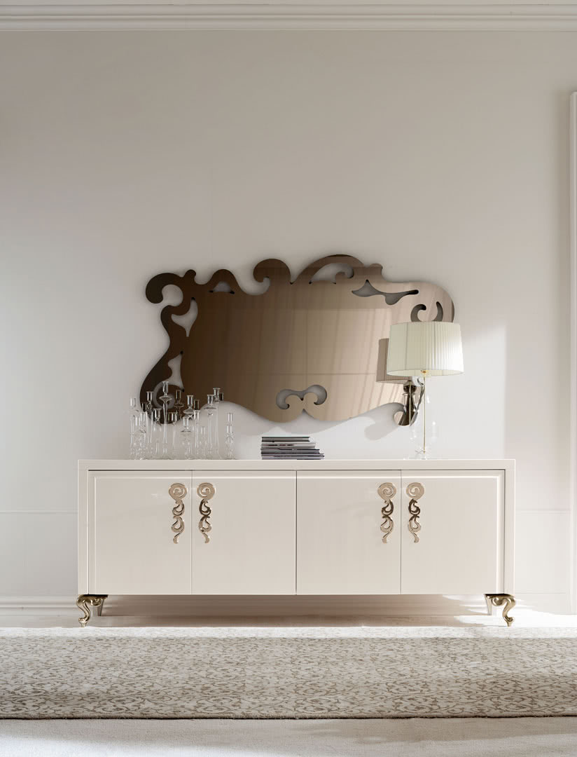 Il vano interno è diviso con ripiani in vetro molato a filo lucido. Dalla linea pulita e rigorosa del buffet risaltano i piedi, in alluminio pressofuso e decorato in foglia, e le maniglie, in ferro tagliato a laser, curvate e levigate artigianalmente in galvanica.