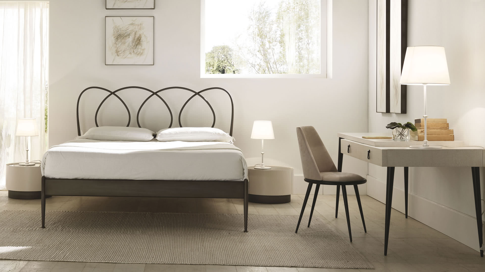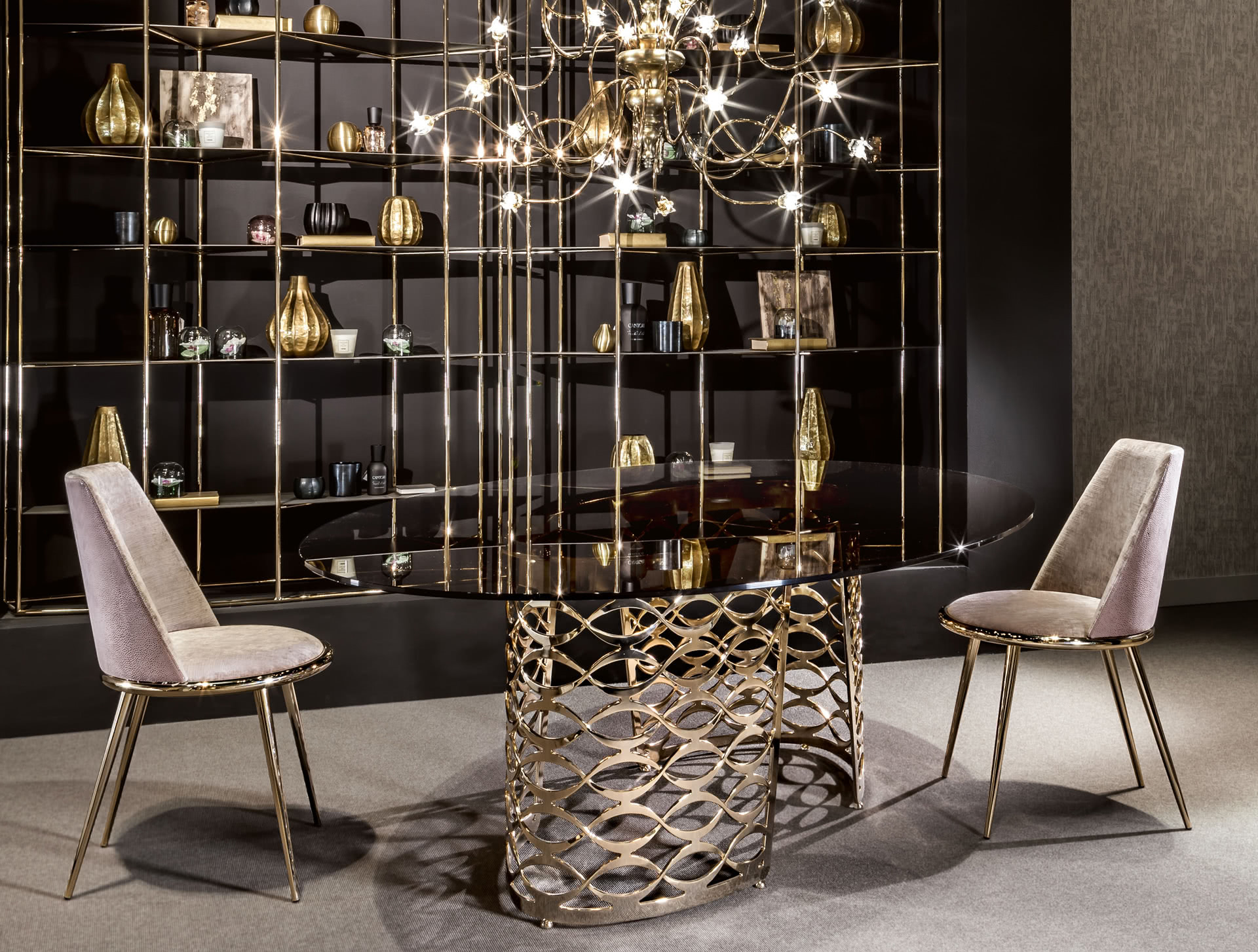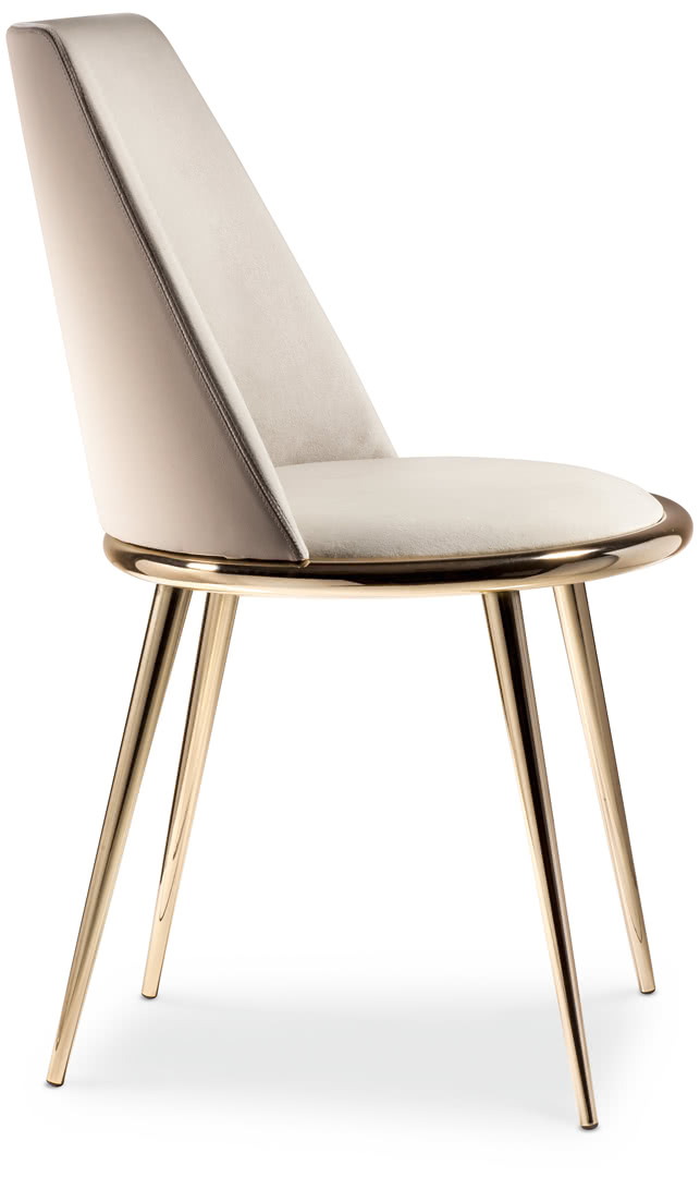 Le gambe sono in ferro conificato a freddo, disponibili nella finitura oro o ferro metallizzato. La seduta e la spalliera, in legno sagomato e curvato, sono imbottite in gomma a due densità e rivestite con una lavorazione sartoriale in tessuto, velluto, pelle o un tessuto fornito dal cliente non sfoderabile.