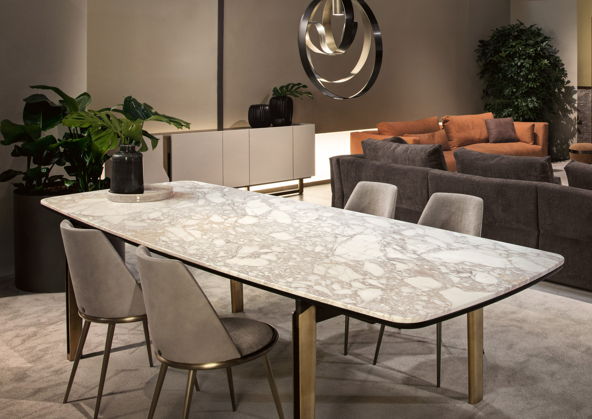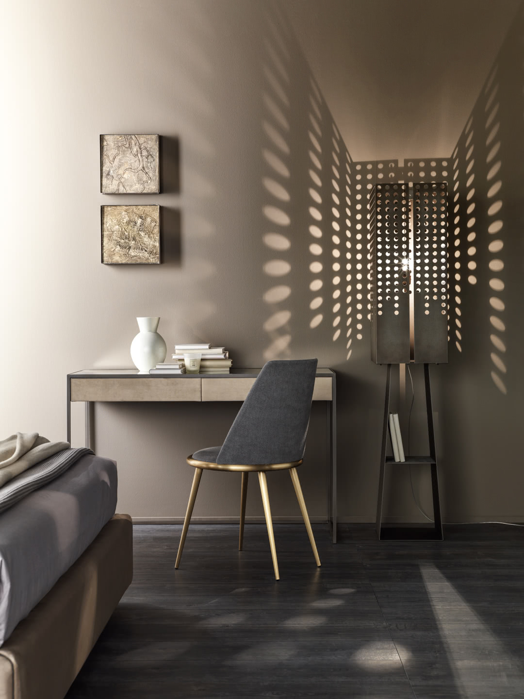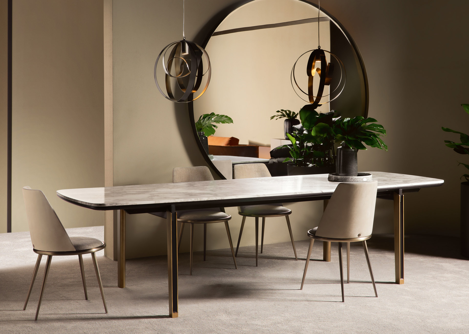 Le gambe sono in ferro conificato a freddo, disponibili nella finitura oro o ferro metallizzato. La seduta e la spalliera, in legno sagomato e curvato, sono imbottite in gomma a due densità e rivestite con una lavorazione sartoriale in tessuto, velluto, pelle o un tessuto fornito dal cliente non sfoderabile.