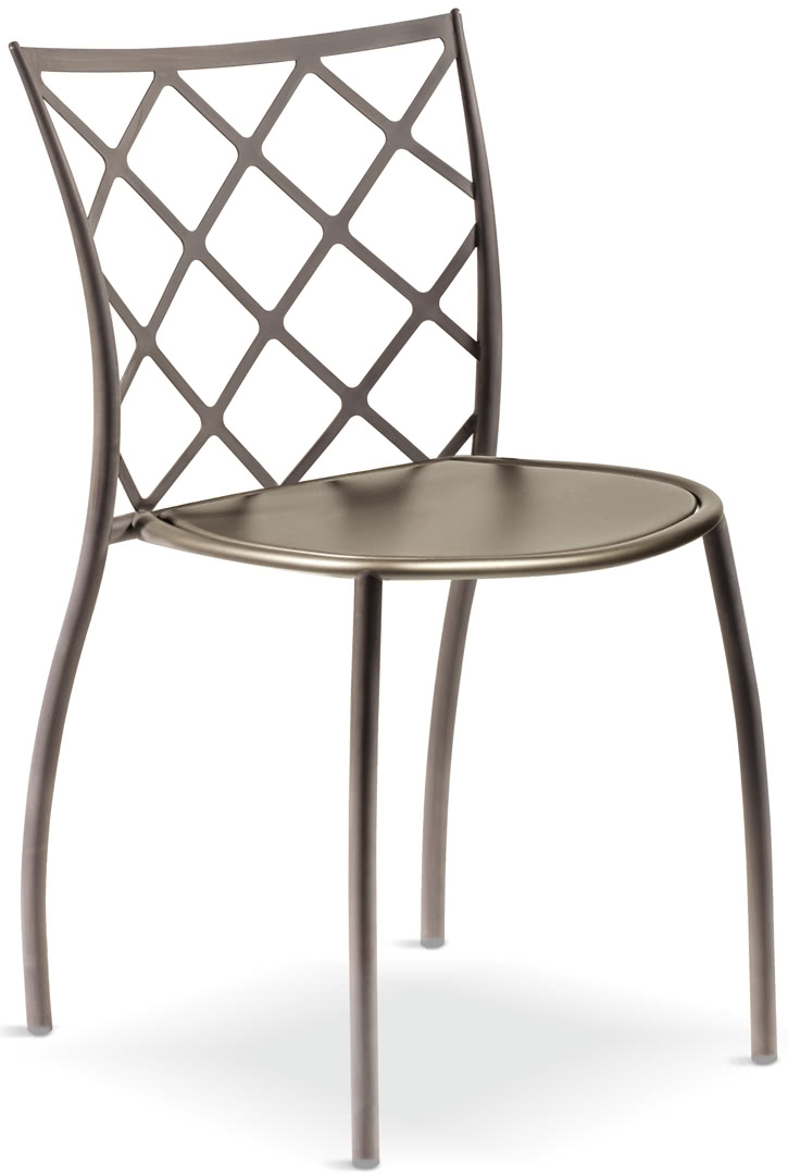 Le gambe sono in metallo tubolare, curvato e conificato, e lo schienale in ferro tagliato a laser. La seduta è disponibile nella versione in ferro con perimetro di rinforzo in tubolare o imbottita. Tutte le saldature sono realizzate a filo e a ottone con levigatura manuale. Le sedie Julie rombi sono impilabili.