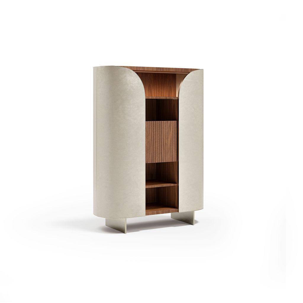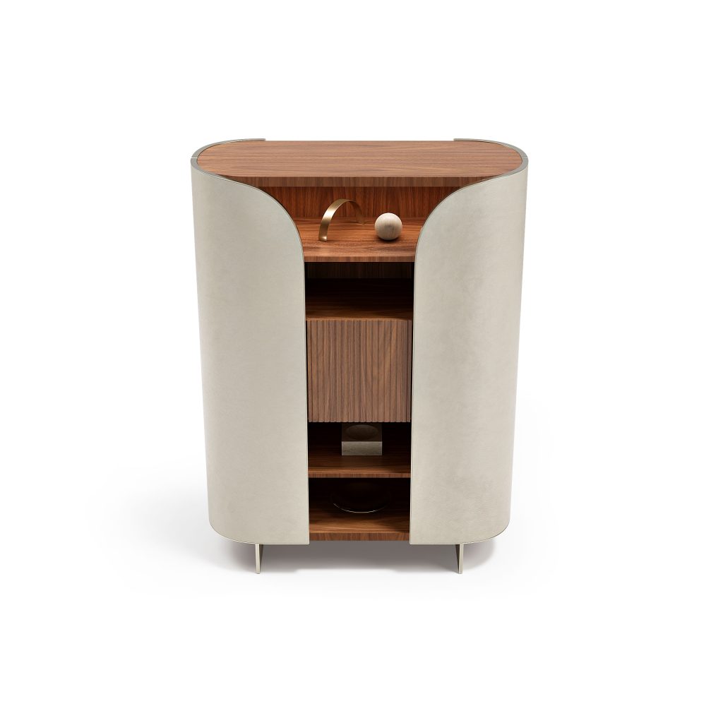 La Collezione Duna incarna l’essenza senza tempo e l’eleganza selvaggia delle maestose dune del deserto. Ispirata alla natura, con le sue forme fluide e la sua grandiosità silenziosa, questa collezione di mobili di lusso trasporta l’atmosfera mozzafiato e la sensazione di libertà trovate nel vasto deserto. Struttura in essenza o laccato. Nr. 2 ante e fianchi disponibili in essenza, laccato o pelle liscia, ripiani interni in vetro bronzato. Parte a giorno composta da Nr. 2 ripiani in essenza o laccato. Nr. 1 contenitore chiuso da 2 ante in essenza o lacatto cannette.