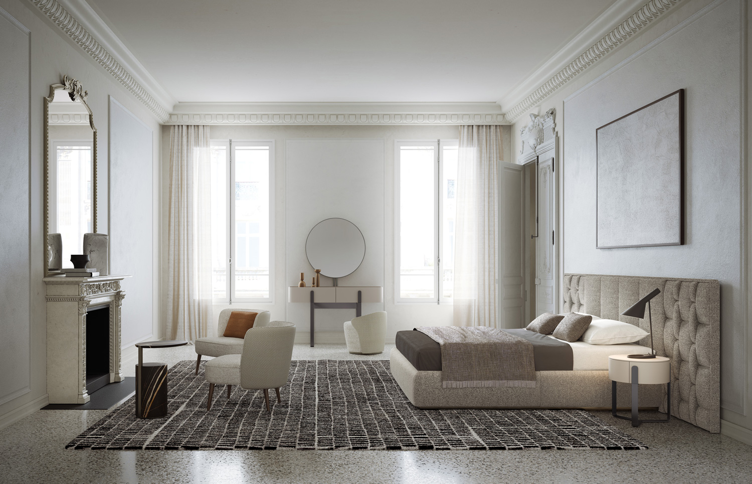 Jubilee: un letto imponente e di forte presenza grazie alla sua lavorazione imbottita ondulata. La testiera conferisce un aspetto morbido ed offre un appoggio confortevole.