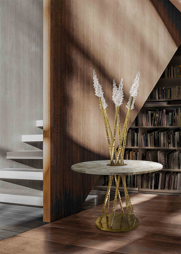 In Lewis side table a bundle of metal pipes that ends up with handmade glass points crosses a precious marble top: the glass points, realized by master glassmakers in Venice area, are enlightened by leds placed inside of metal pipes. More than a piece of furniture this exclusive element is able to enhance a great atmosphere in a refined and elegant environment.