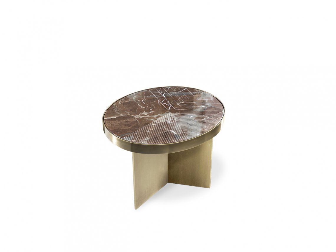 This side table Linfa is characterized by a precious marble top with parallel engravings that create geometrical patterns on the surface: the metal parts, available in different finishes, both envelope the marble and support the top. It’s also available a bigger side table to be matched with this one.
