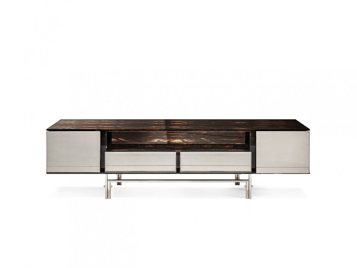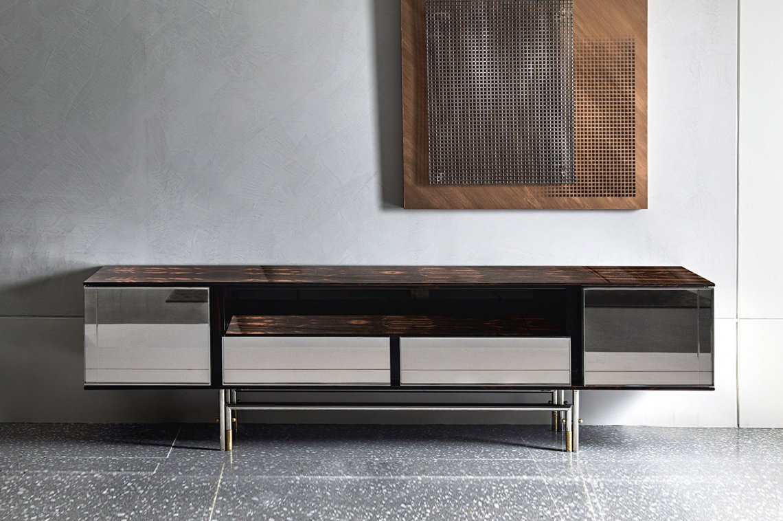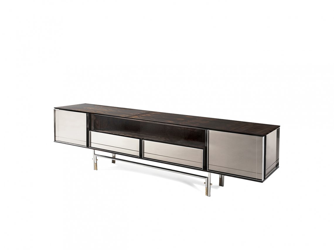 The storage unit Harbour is an expression of the ancient Italian cabinet-maker tradition when the attention to detail and the use of precious woods were applied both to visible parts and to the internal parts intended to accommodate objects of great value. This piece of furniture is made in valuable Ziricote wood with metal details and engraved bronze mirrors combined to create a geometric design on each door.