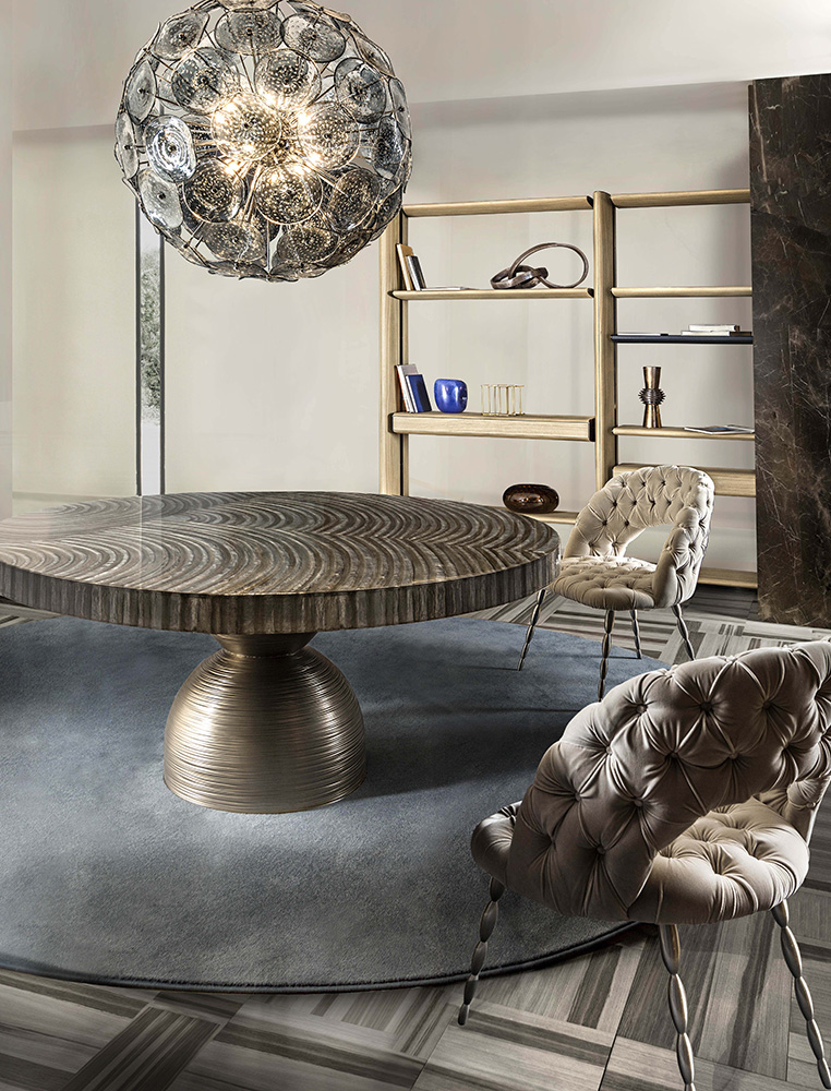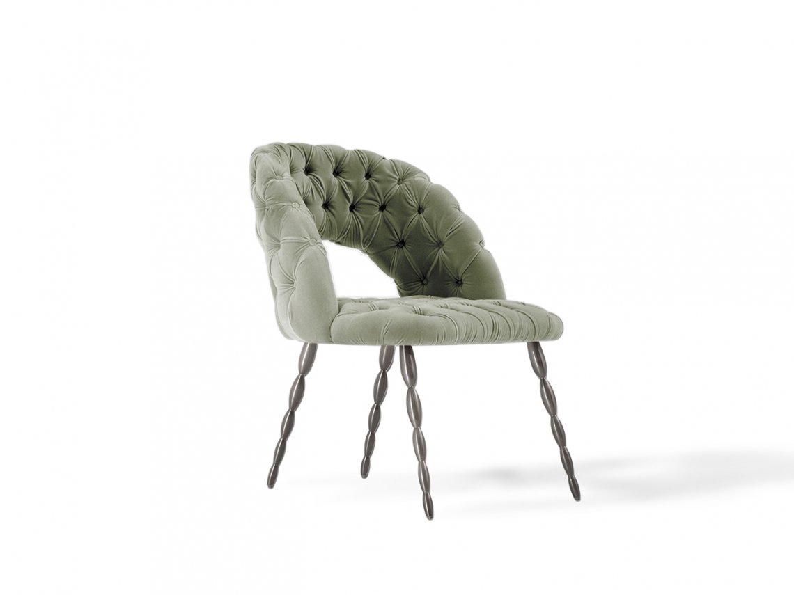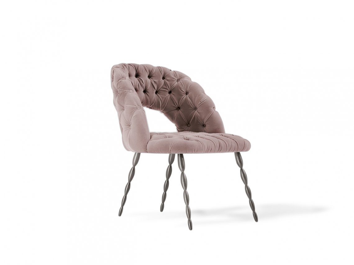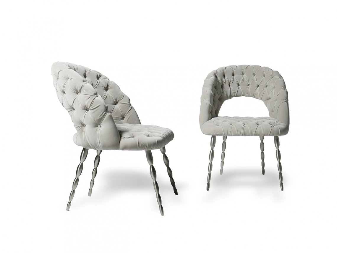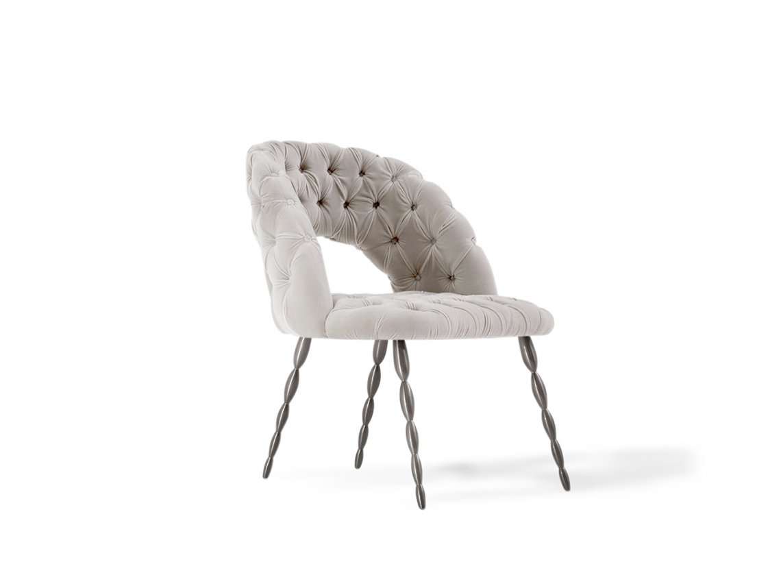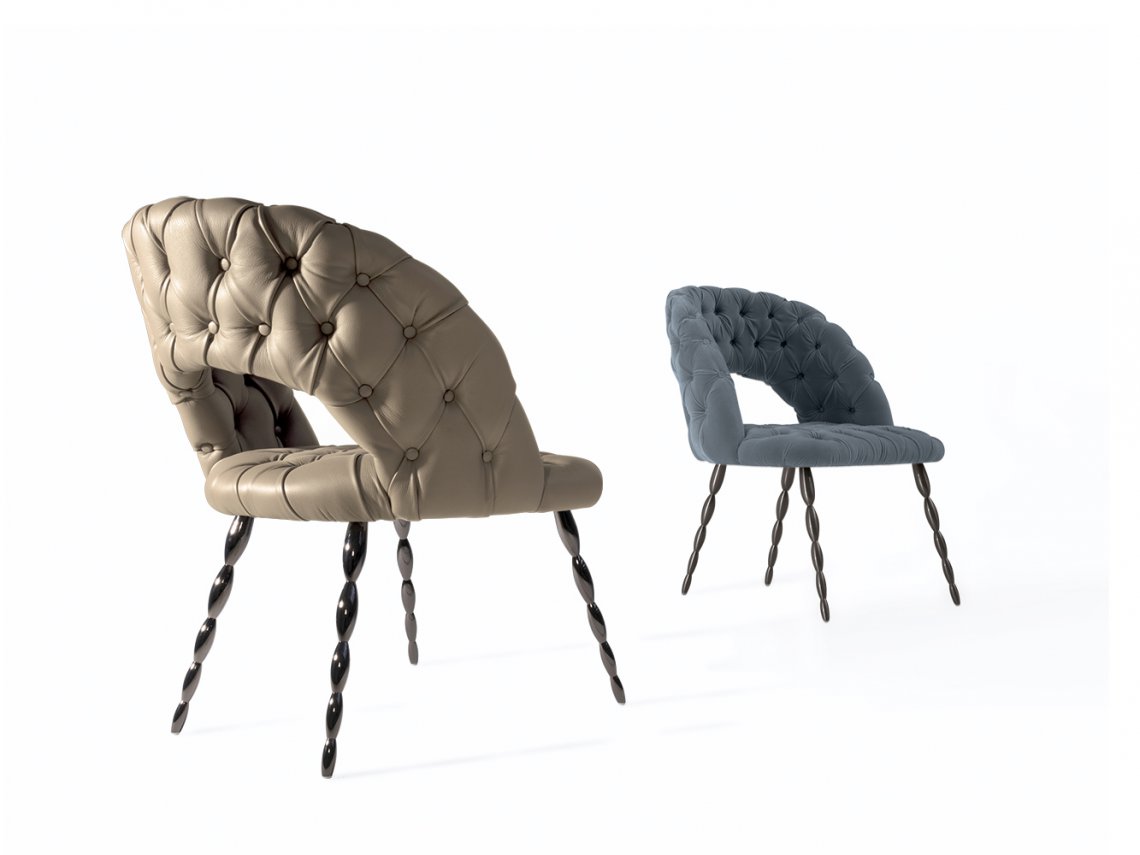 The craftsmanship is reinterpreted and updated in the chair Holly characterized by an elegant capitonnè upholstery. Great attention is paid to comfort thanks to a soft padding with an enveloping design that is particularly suitable when matched with round tables. The legs, strictly made in metal, stretch outwards in a succession of egg-shaped elements tapering gradually towards the floor. A wide range of exclusive fabric and leather covers and many types of metal finishing offer a high level of customization.
